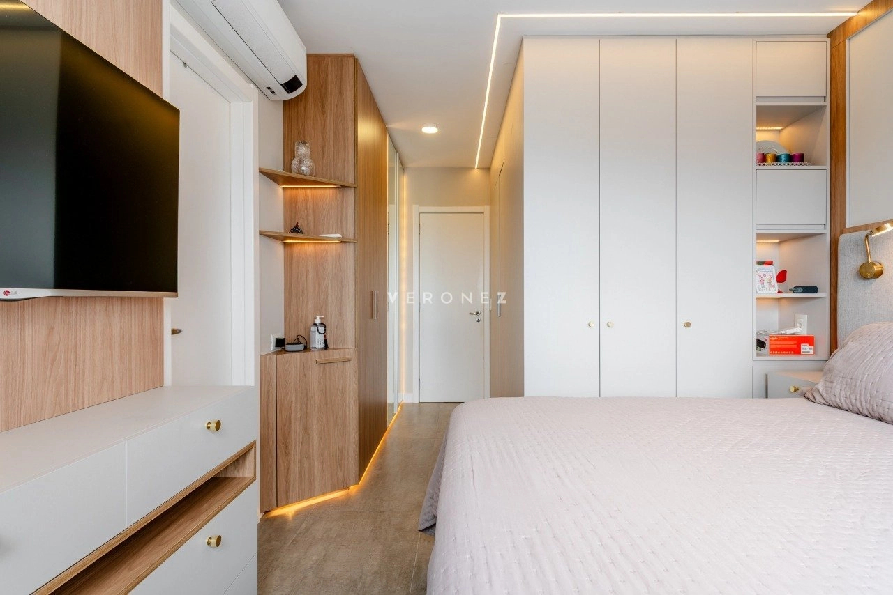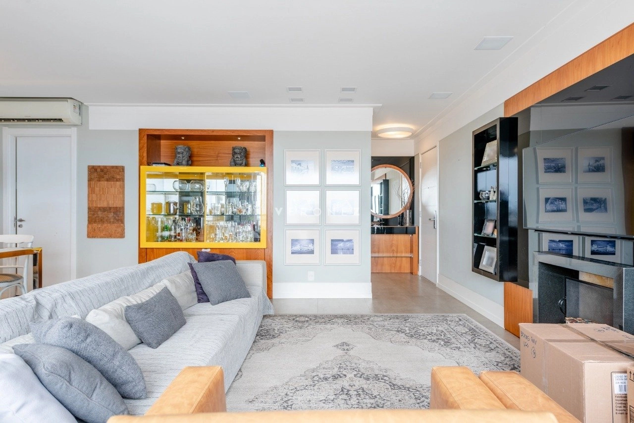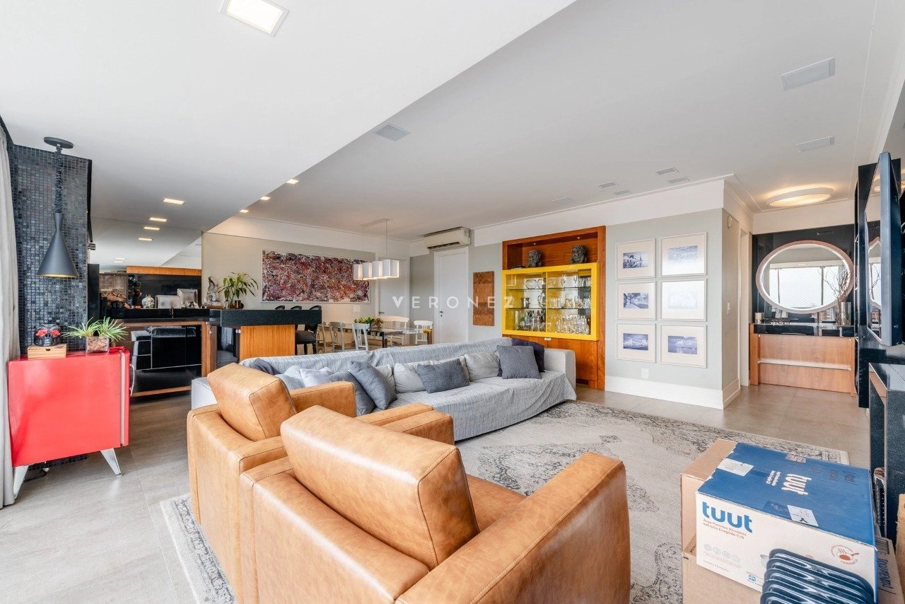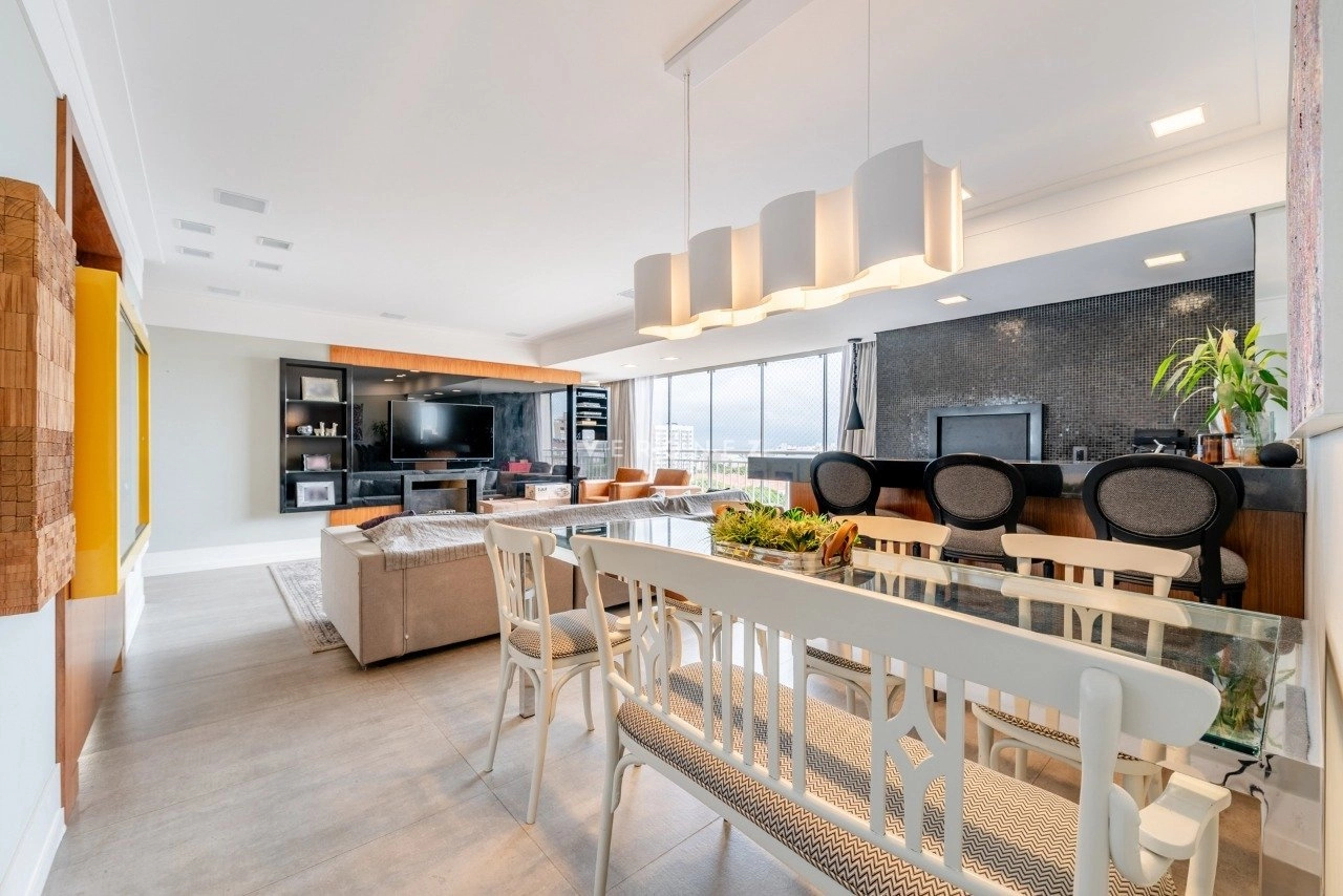Apartamento de 130 m², totalmente mobiliado, com 3 dormitórios, sendo 3 suítes, lavabo e 2 vagas de garagem. O imóvel conta com móveis planejados em todos os ambientes, piso em porcelanato, living com churrasqueira integrada, ar-condicionado split e área de serviço com lavanderia, oferecendo conforto e praticidade para o dia a dia.