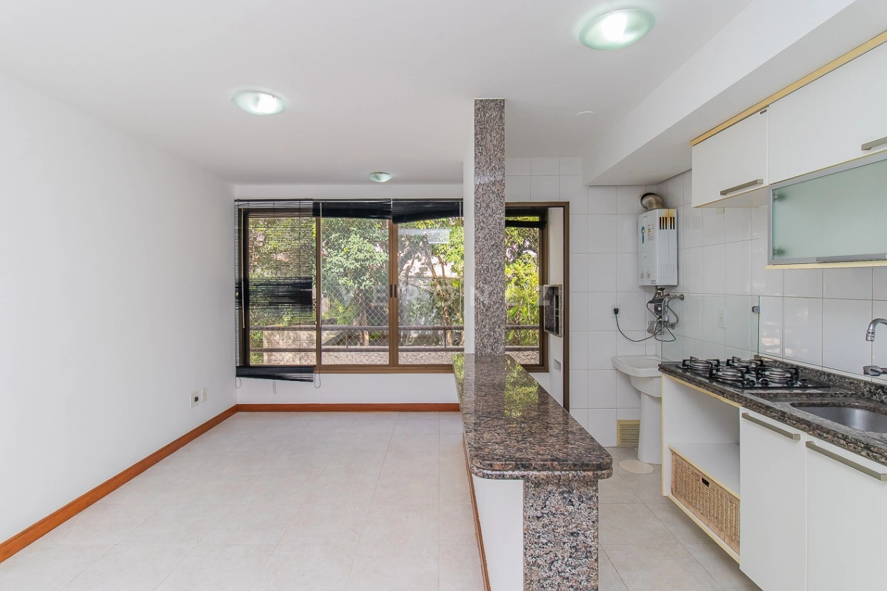 Apartamento com 1 dormitório (quarto), living amplo com churrasqueira, cozinha americana com área de serviço e banheiro social com hidro. Living com janela ampla que permite excelente iluminação e ventilação. Permitido pets. Prédio com elevador. Construção de 2005, moderna e utilizando acabamentos em granito. Excelente localização, próximo ao centro da cidade e a poucos minutos do parque da redenção, shopping total e Colégio Rosário.