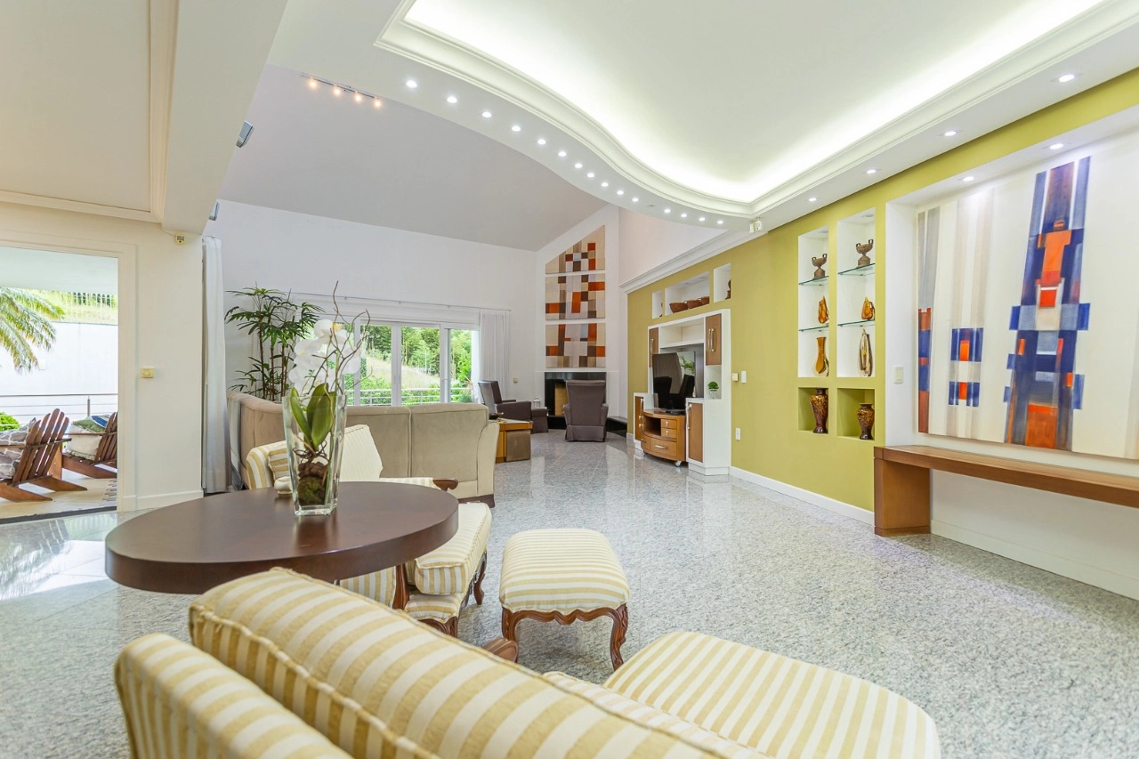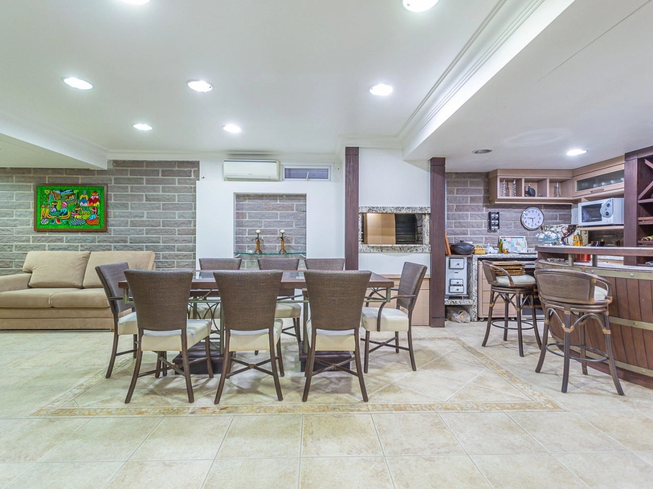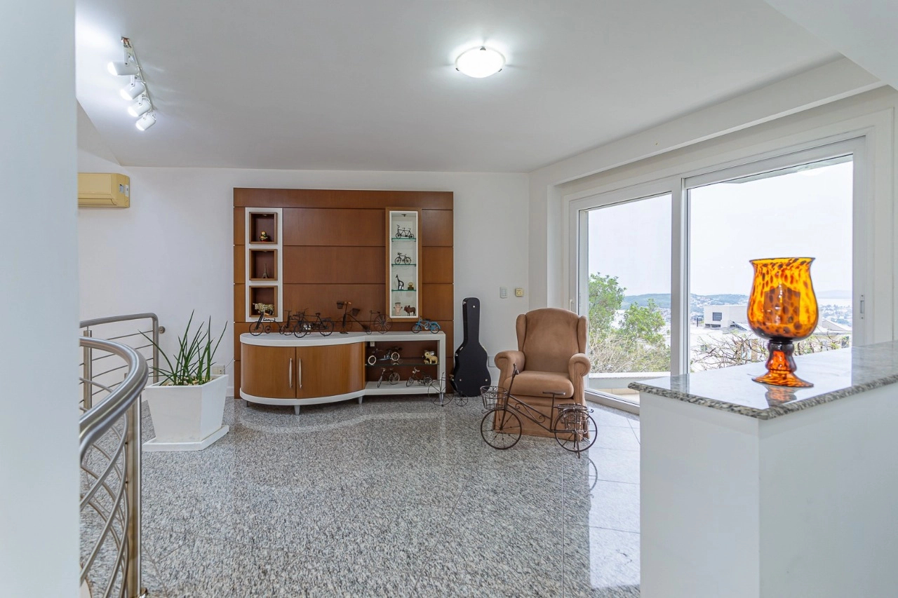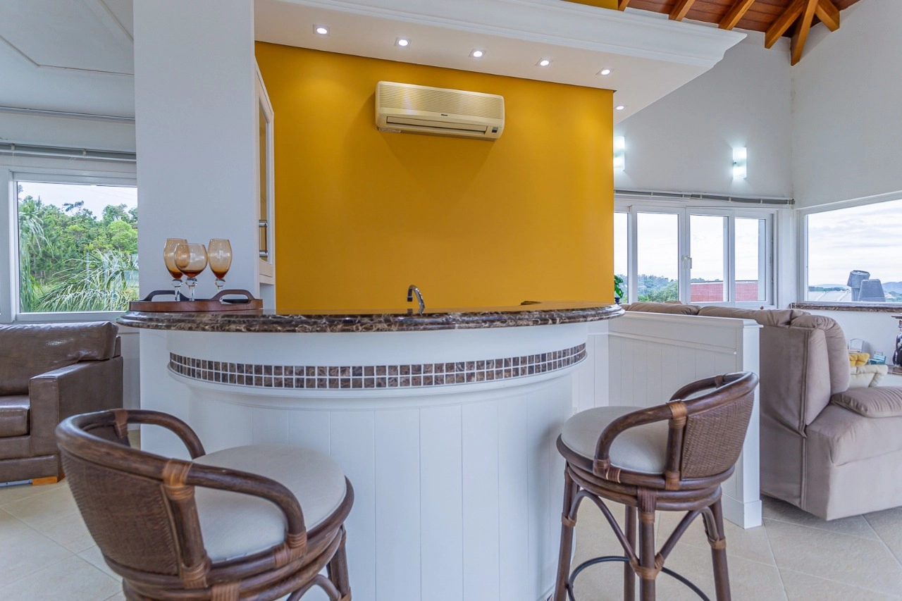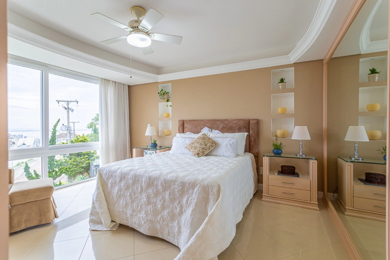 Casa em condomínio distribuída em 4 pavimentos. Vista espetacular para o Rio Guaíba e cidade. Semi mobiliada,2 dormitórios sendo 1 suíte com closet hidromassagem, com piso, louças e metais em material importado e no mezanino opção para mais 1 dormitório, gabinete, banheiro social, amplo living para 3 ambientes com pé direito duplo, todo em porcelanato Classe A, lareira, lavabo e sala de jantar com acesso direto ao pátio com jardim e piscina. Último pavimento com academia, estar com lareira e bar, banheiro privativo, rouparia e 2 terraços com esplêndida vista panorâmica da cidade e do Guaíba. Pavimento ao nível da rua com 4 vagas de garagem fechada, banheiro auxiliar, oficina e despensa, salão de festas integrado com adega e de extremo bom gosto. Pátio ao fundo com piscina, paisagismo e avarandado que se integra a sala de jantar, living e cozinha. Área de preservação limitando com fundo do terreno. Piso aquecido em praticamente toda a residência. Monitoramento por câmeras de segurança, cerca elétrica, alarme e muros blindados. Condomínio com portaria 24 horas , salão de festas, quadras de esportes, beach tênis, playground, trilha para caminhadas e quiosque com churrasqueira.