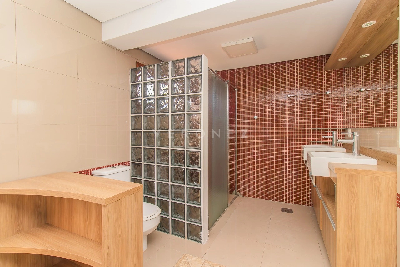 O primeiro pavimento conta com três dormitórios, sendo uma suíte máster com banheira de hidromassagem e closet, ampla sala de estar com teto rebaixado em gesso e lareira, piso porcelanato e sacada toda envidraçada, sala de jantar, cozinha completa, lavanderia, aquecimento de água à gás.