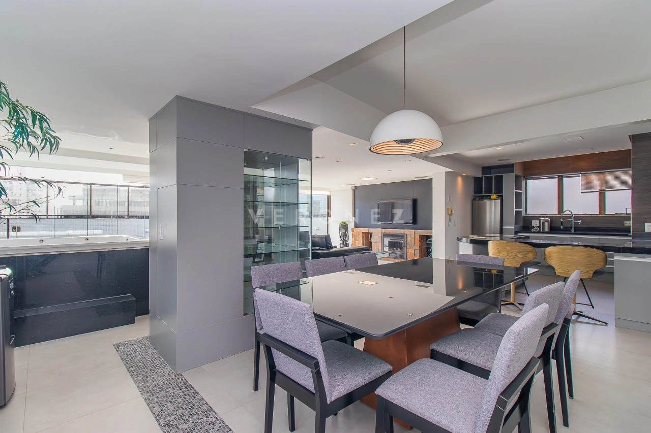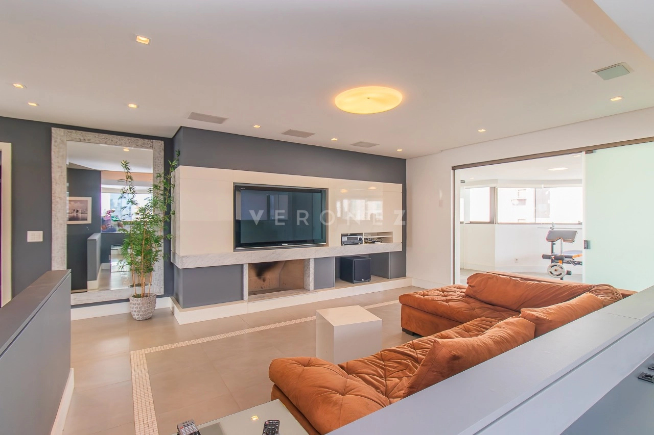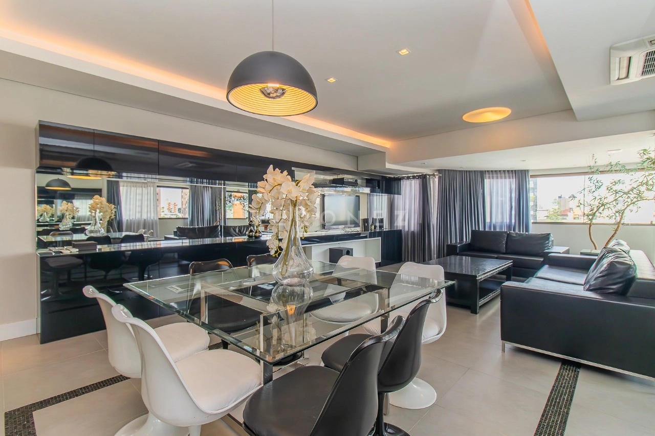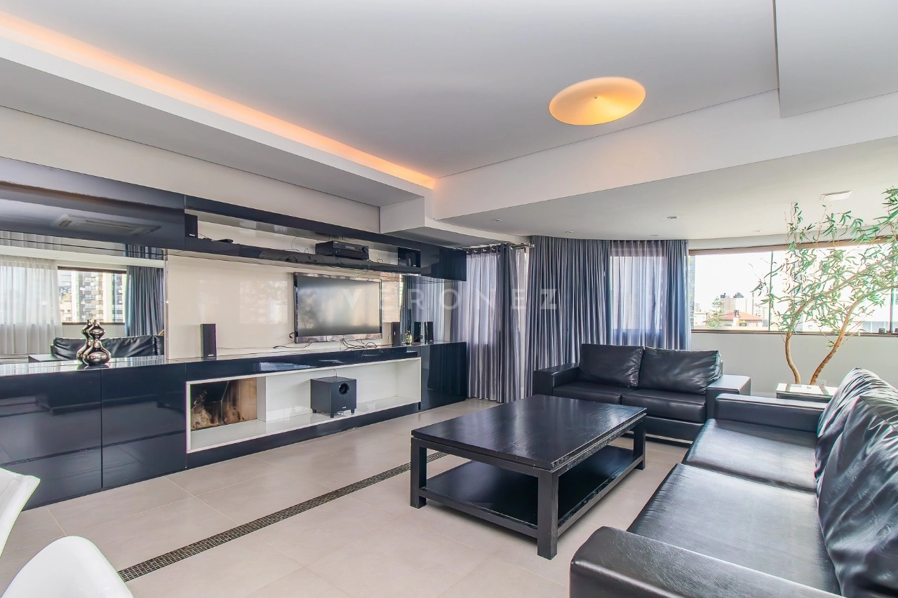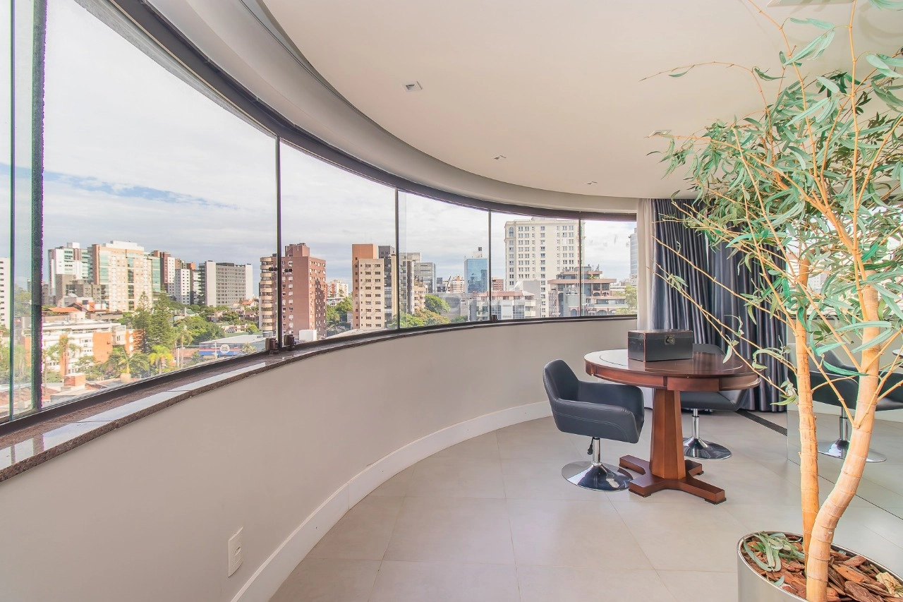 Cobertura duplex de 326,74m² privativos, mobiliada, com linda vista da cidade, na melhor região do bairro Petrópolis. Na parte de baixo três(3) suítes, uma delas master, jacuzzi, piso aquecido e split. Generoso living de três(3) ambientes com lareira e home theater, sala de jantar, lavabo, generoso gabinete interligado com a sala, ampla cozinha com ilha, copa e elevador para mandar mantimentos para a cozinha de cima, ampla lavanderia separada. No andar de cima temos ampla academia, 2 generosas salas com lareira, sendo que uma delas tem gabinete integrado, e a outra tem amplo espaço gourmet, sala de jantar, uma grande jacuzzi e saída para o pátio. Finamente decorado por arquiteto com lindos móveis sob medida em todo o apartamento. O apartamento é bem ventilado e pega sol o dia todo com 5 vagas de garagem individuais lado a lado.