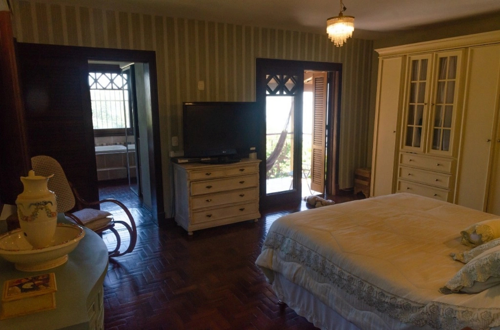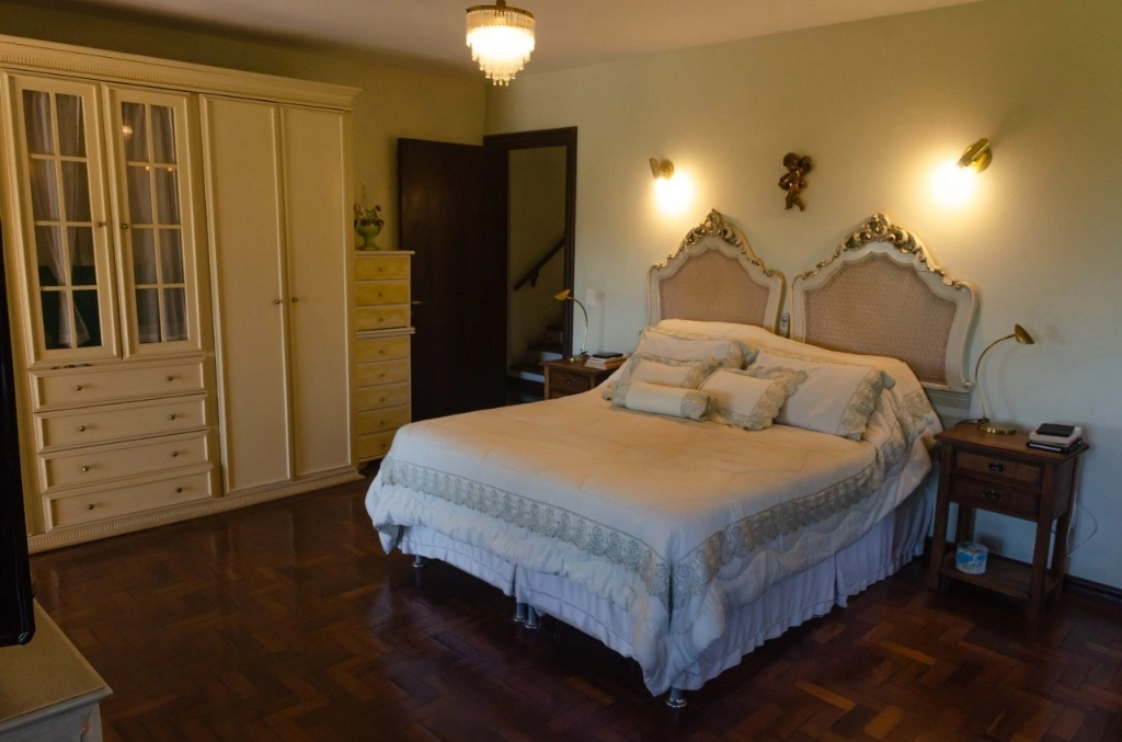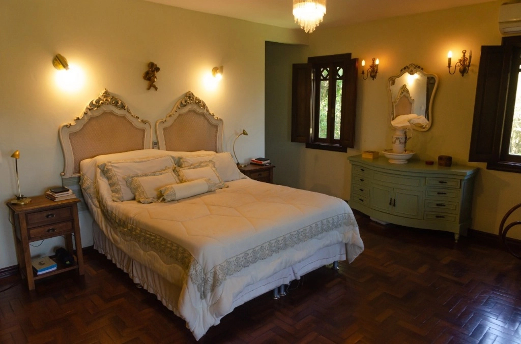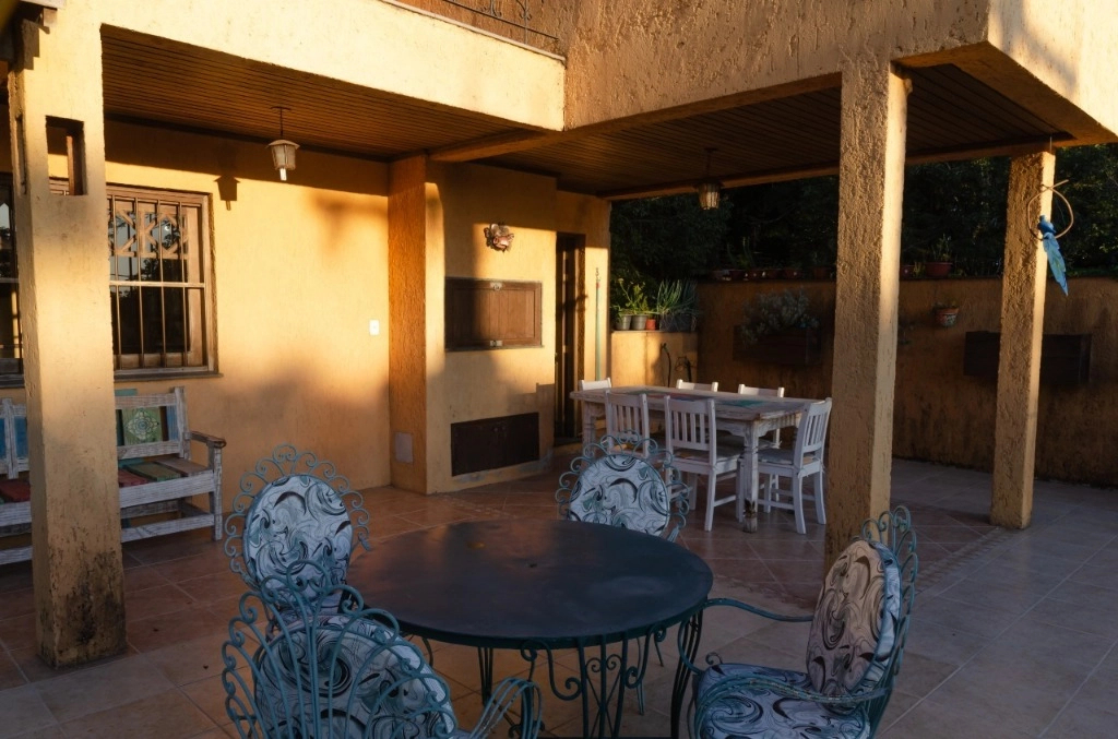 Pavimento intermediário: espaçosa ala social com cozinha americana, sala de jantar com churrasqueira, sala de estar com lareira, amplo terraço com churrasqueira, lavabo, sala de TV (opção para quarto), jardim de inverno e lavanderia. Amplo pátio com árvores frutíferas. Canil