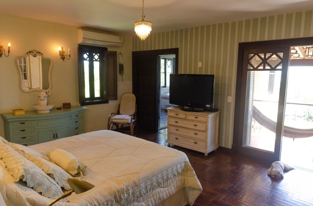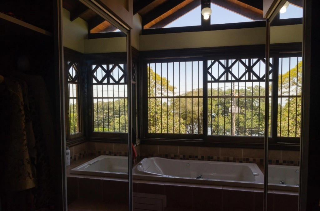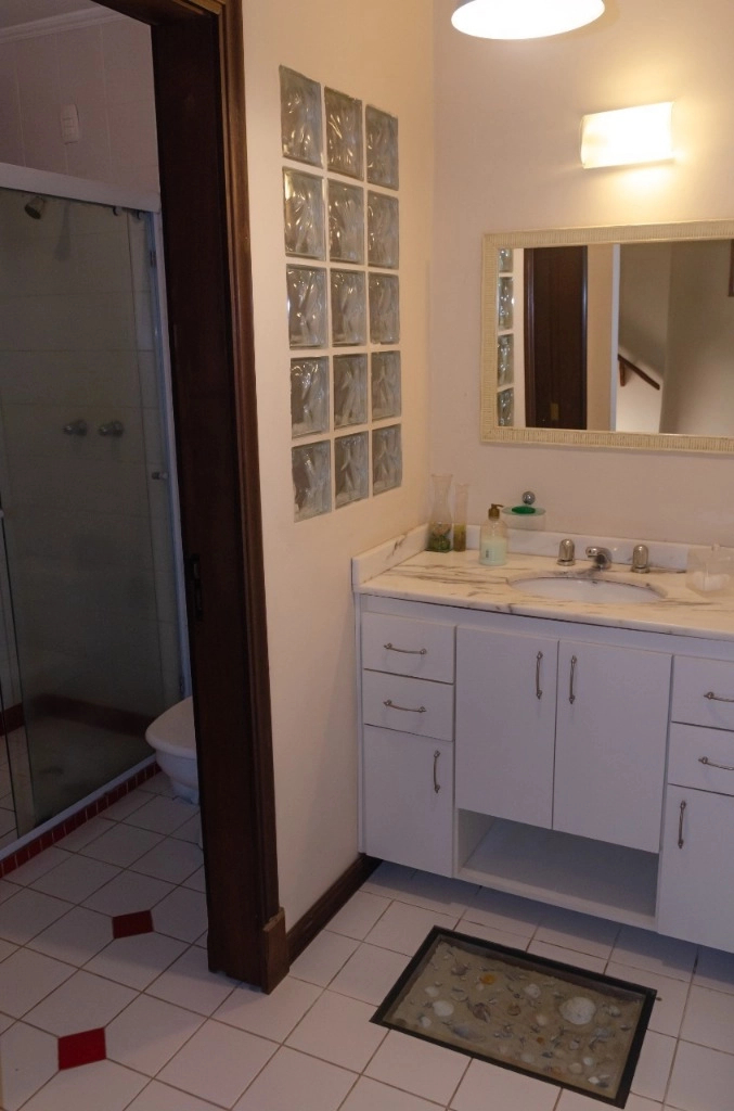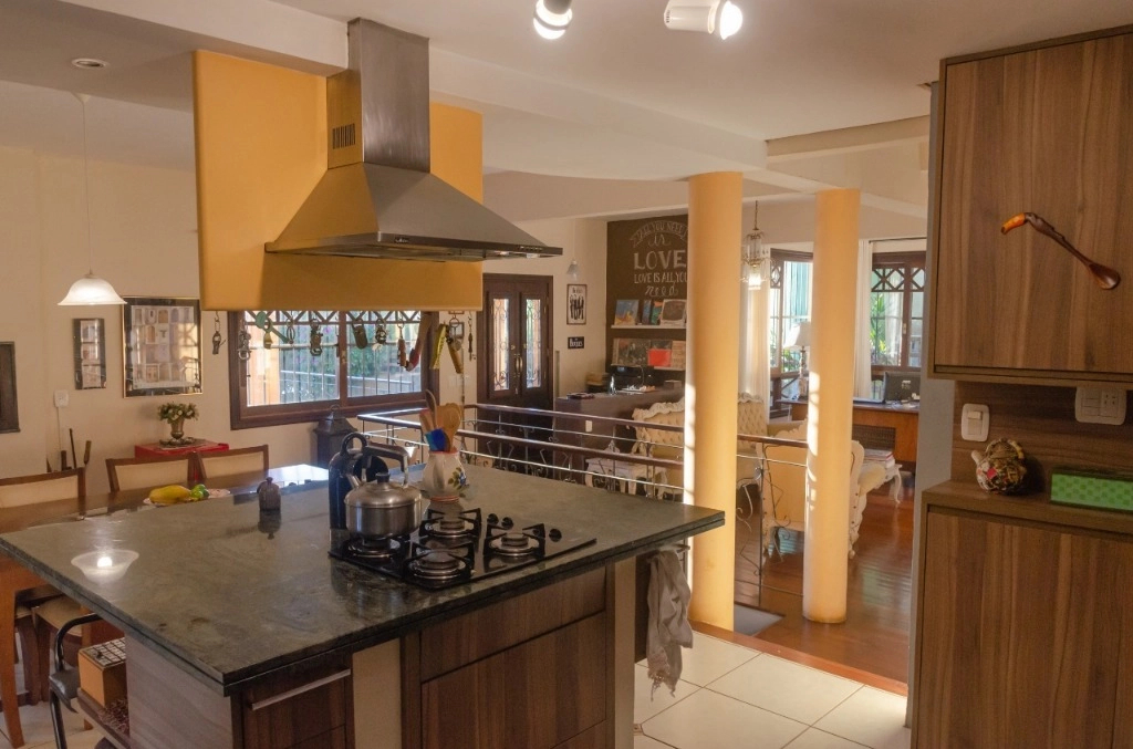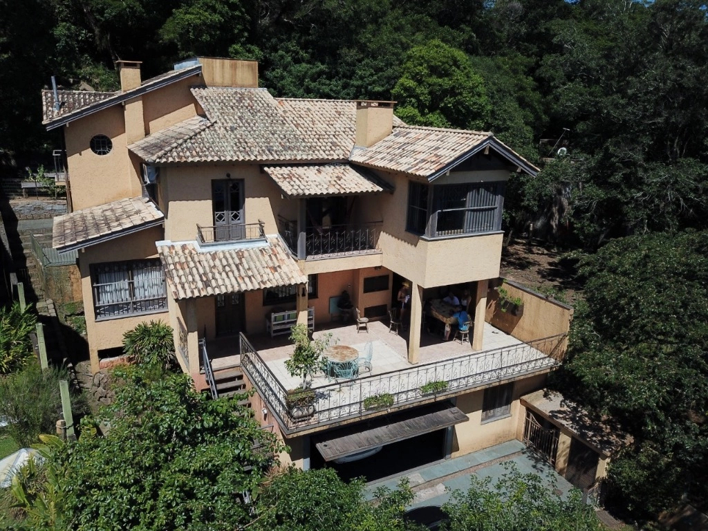 Pavimento intermediário: espaçosa ala social com cozinha americana, sala de jantar com churrasqueira, sala de estar com lareira, amplo terraço com churrasqueira, lavabo, sala de TV (opção para quarto), jardim de inverno e lavanderia. Amplo pátio com árvores frutíferas. Canil