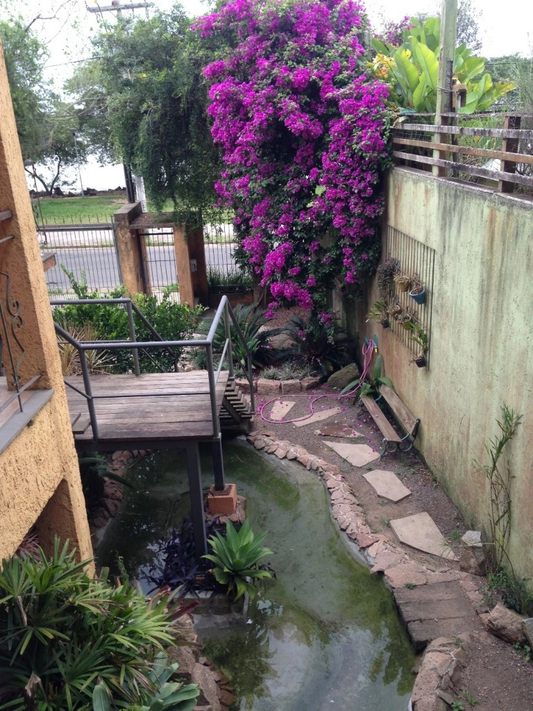 Térreo: garagem para 2 carros, com rocha natural aparente, quarto e banheiro. Jardim com lago artificial e cascata e vagas abertas para 2 carros na frente.