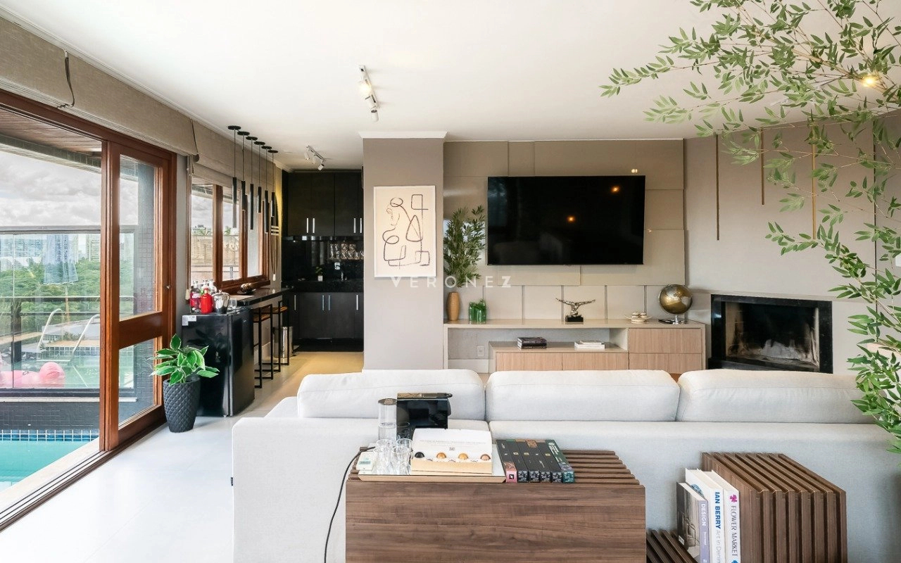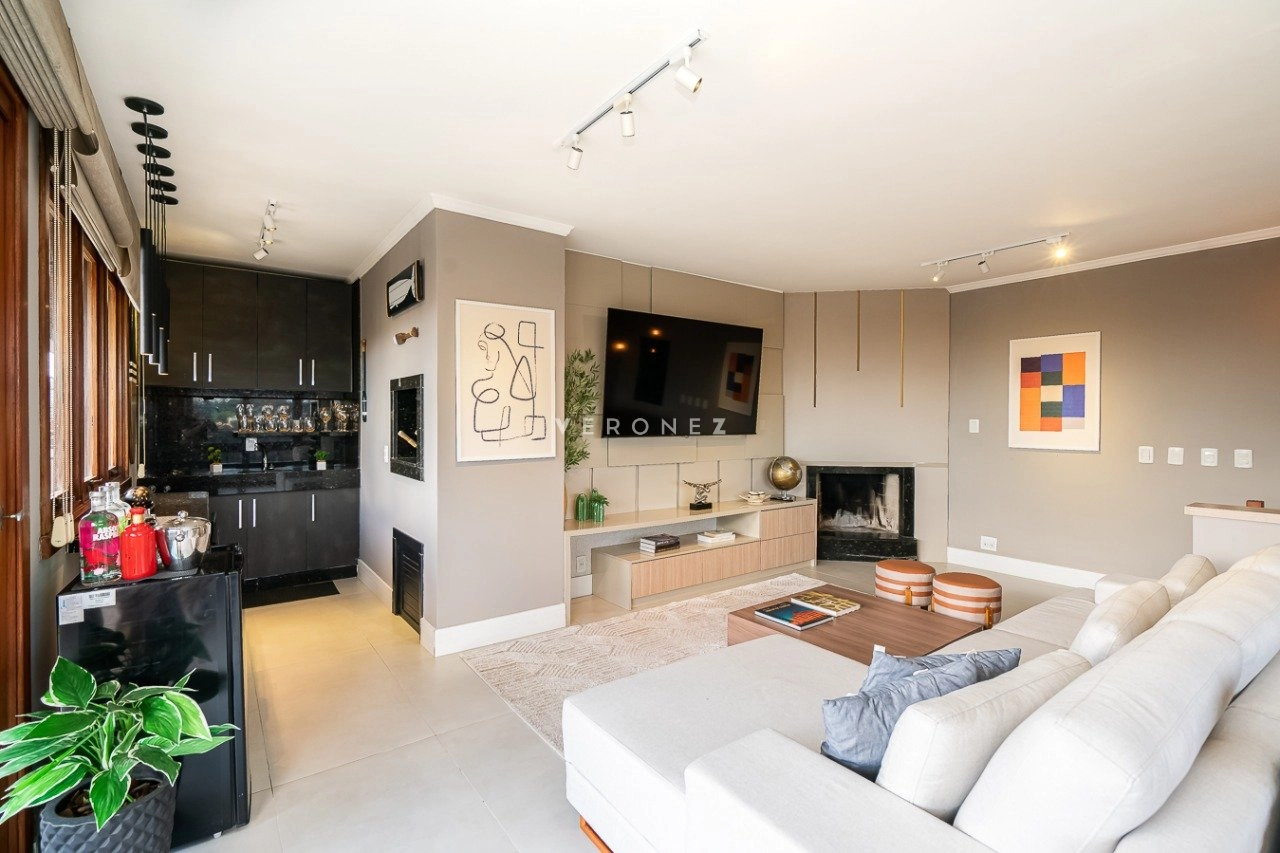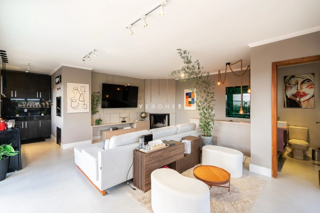 No andar inferior, a sala de estar e jantar possui pé-direito duplo, complementada por uma cozinha americana com ilha, enquanto no andar superior encontra-se um espaço gourmet completo e mais uma cozinha com churrasqueira. A sala de TV possui lareira para maior aconchego. Todo o piso do imóvel é em porcelanato classe A e o projeto foi assinado por um designer de interiores. A área externa conta com uma piscina aquecida com cascata, deck, iluminação especial, paisagismo e um pergolado.