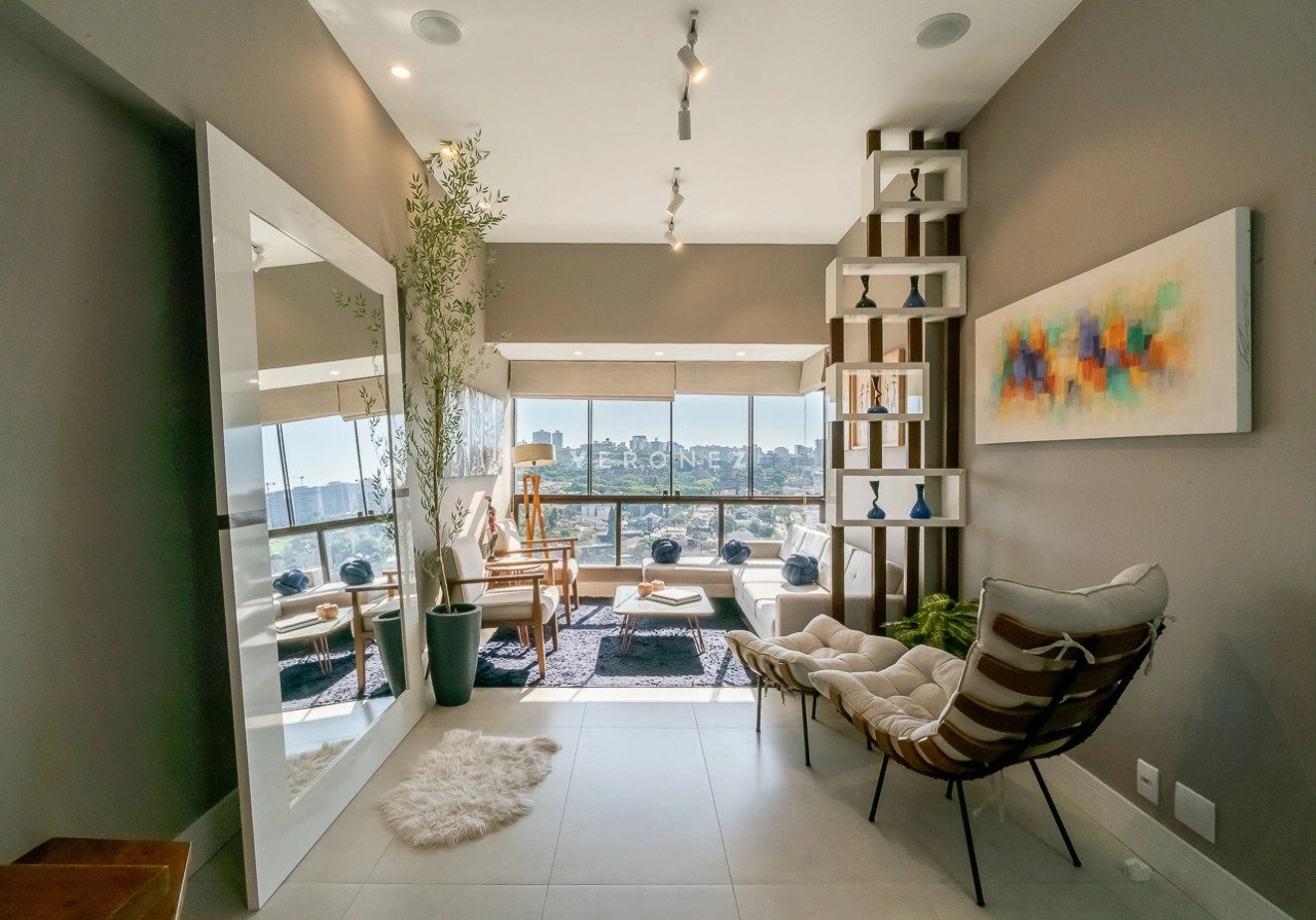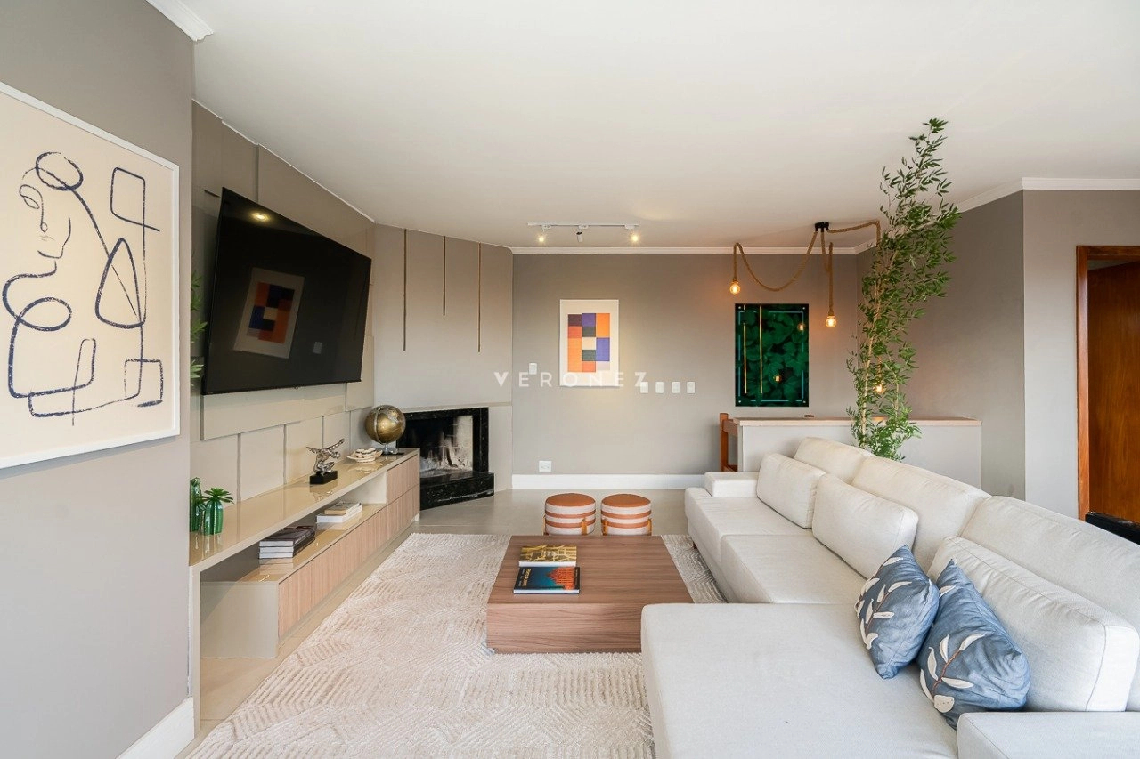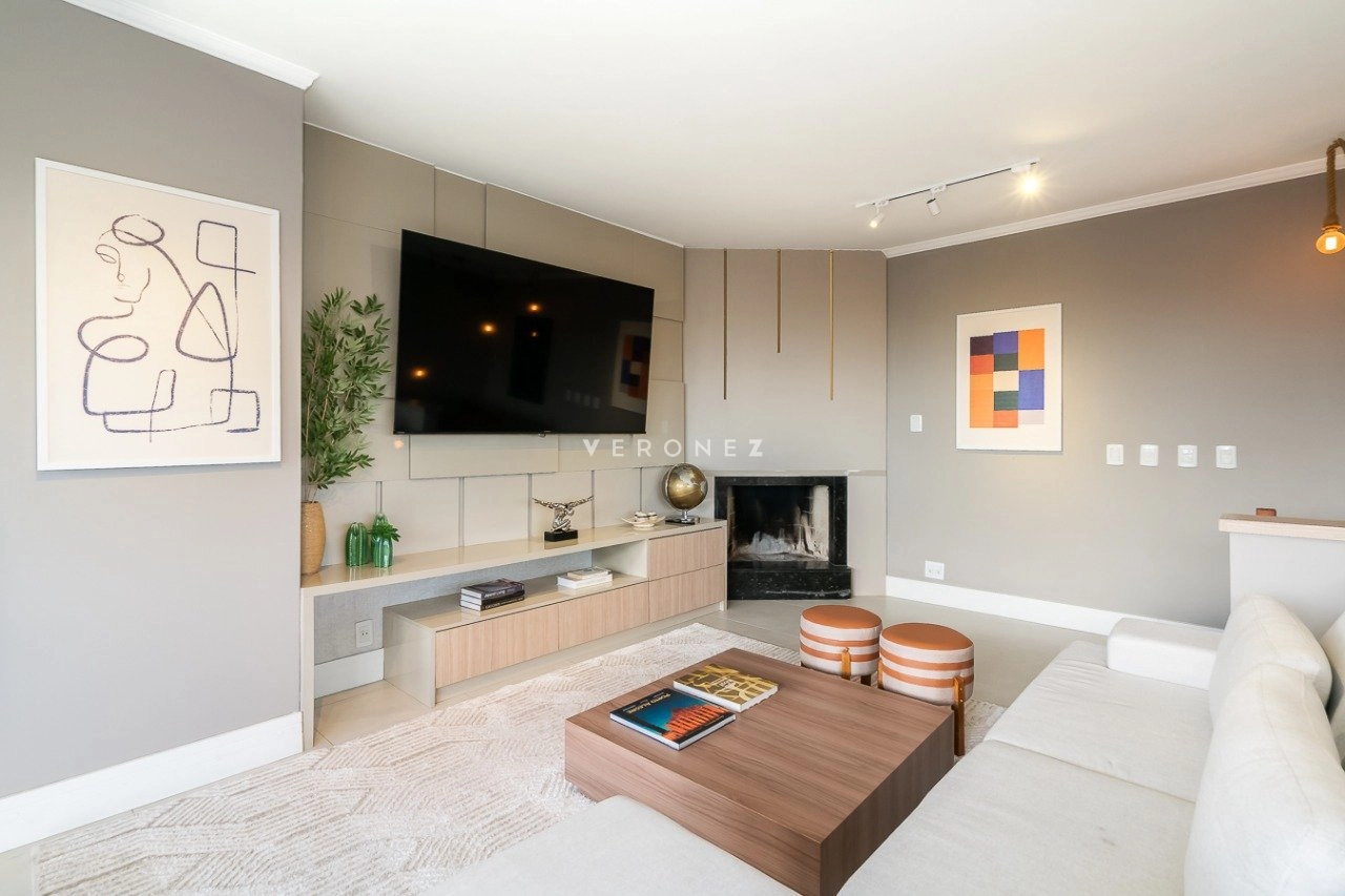 No andar inferior, a sala de estar e jantar possui pé-direito duplo, complementada por uma cozinha americana com ilha, enquanto no andar superior encontra-se um espaço gourmet completo e mais uma cozinha com churrasqueira. A sala de TV possui lareira para maior aconchego. Todo o piso do imóvel é em porcelanato classe A e o projeto foi assinado por um designer de interiores. A área externa conta com uma piscina aquecida com cascata, deck, iluminação especial, paisagismo e um pergolado.