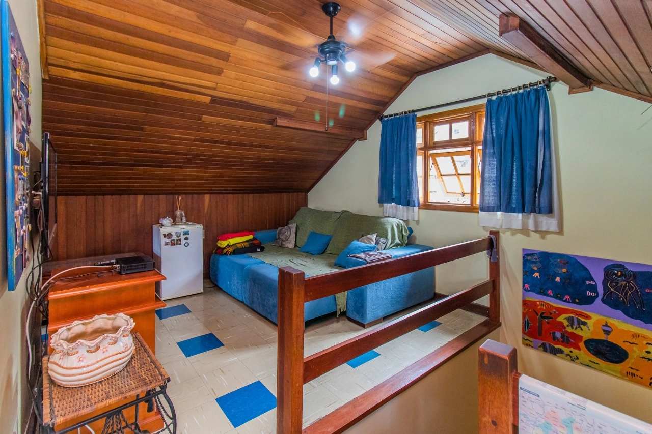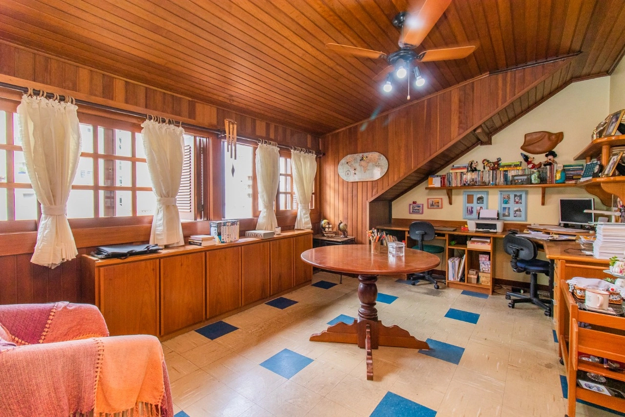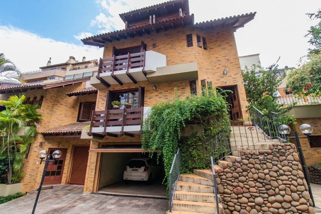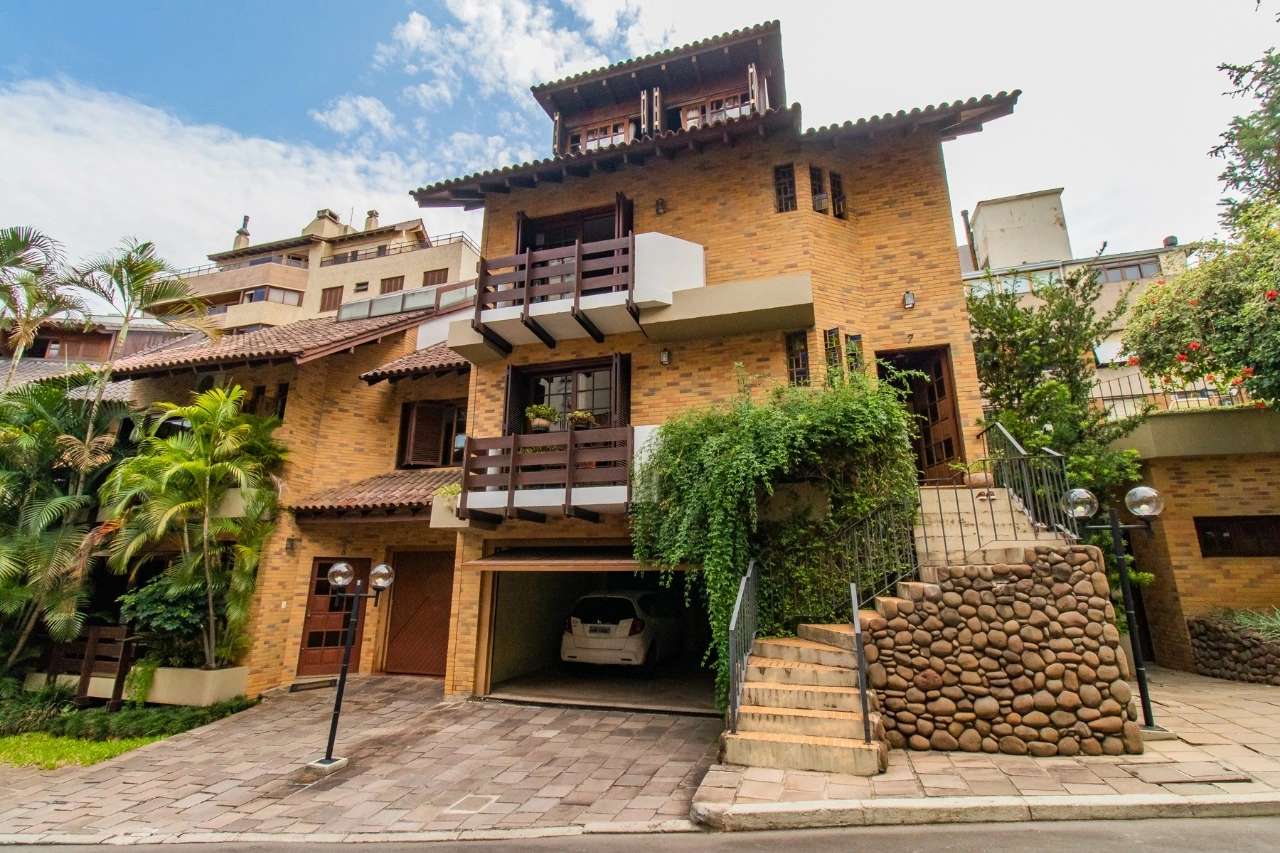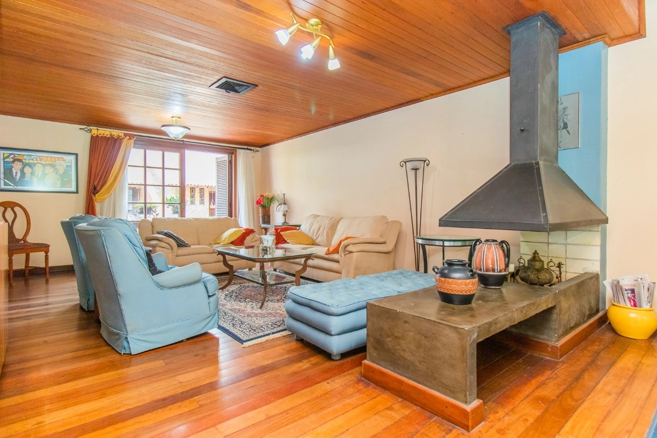 A residência de 4 pavimentos possui 3 dormitórios, sendo 1 suíte com closet, amplo living de 2 ambientes com lareira, churrasqueira, área externa, área intima de televisão no último andar, área de serviço espaçosa e garagem para 3 automóveis.