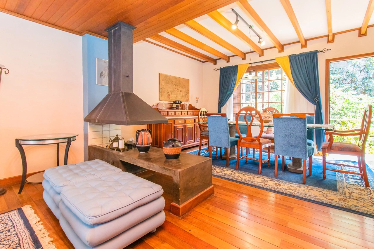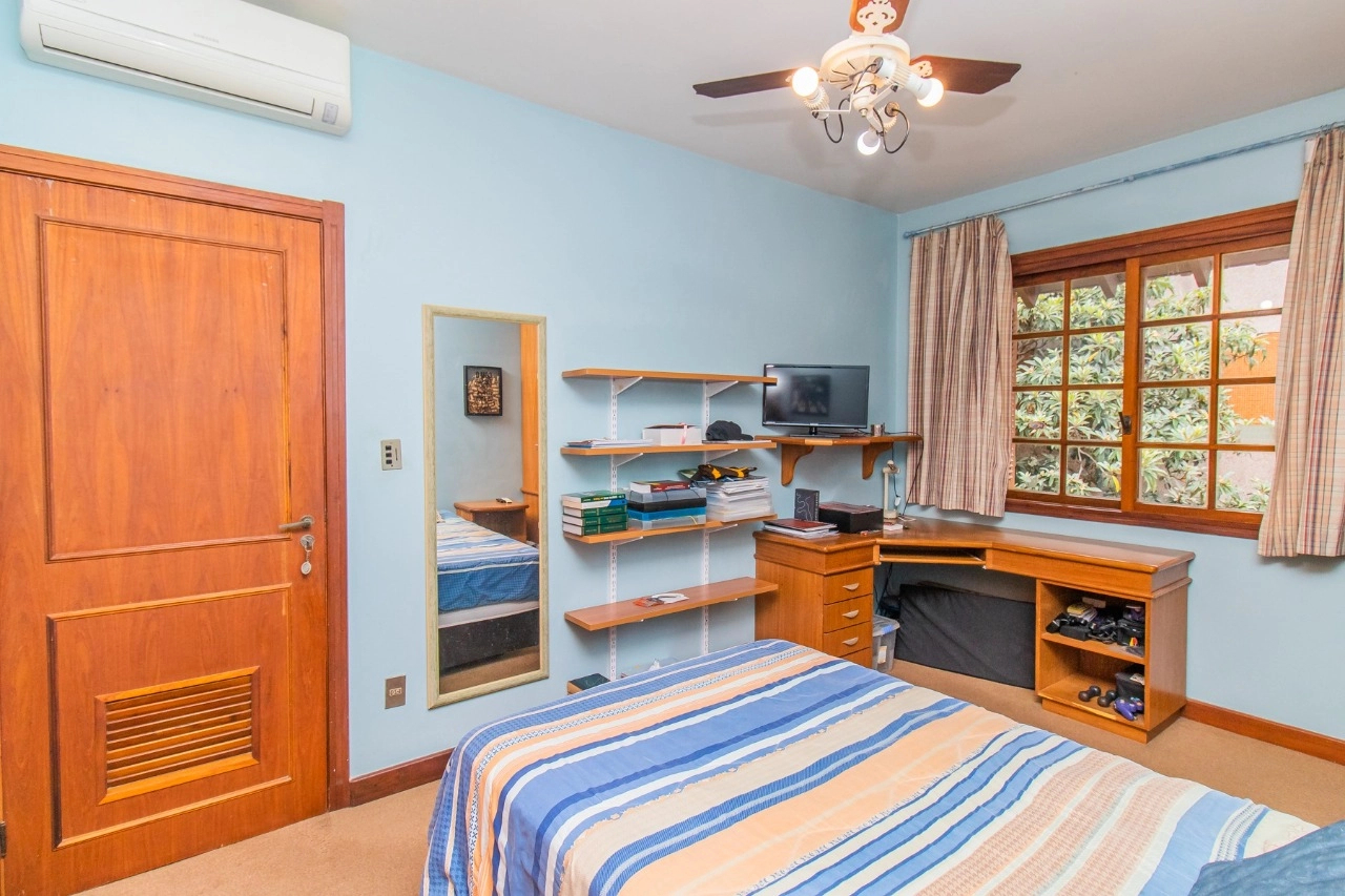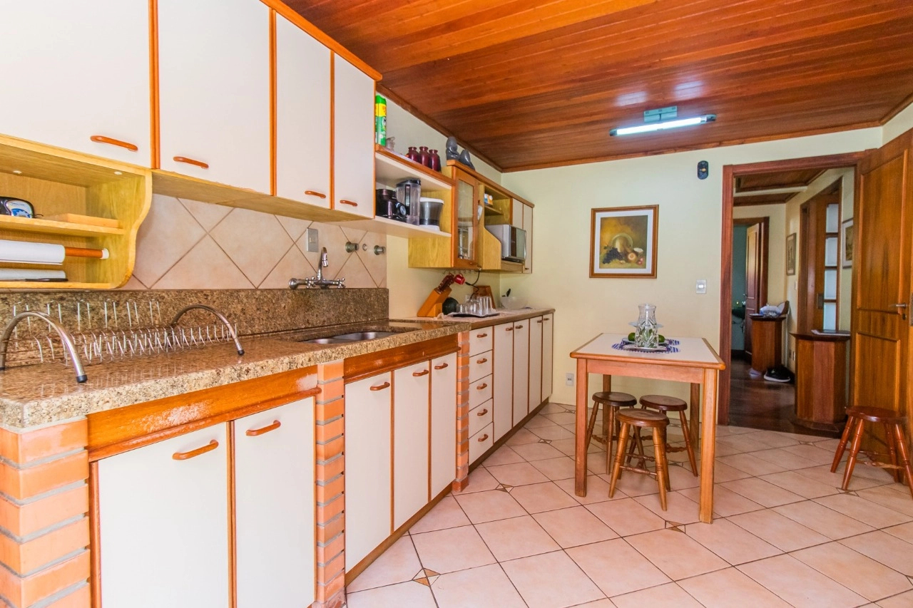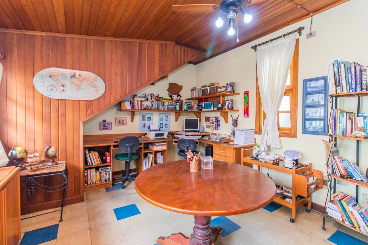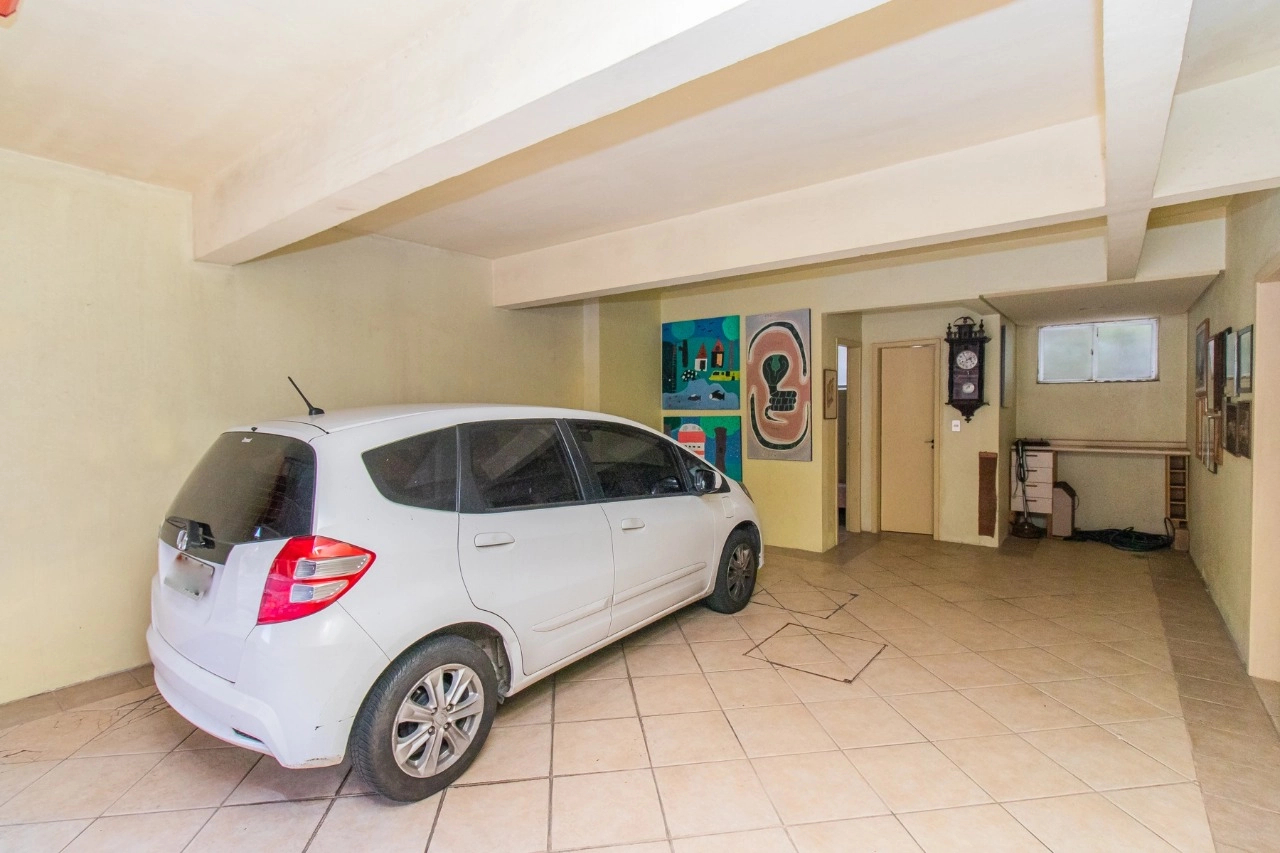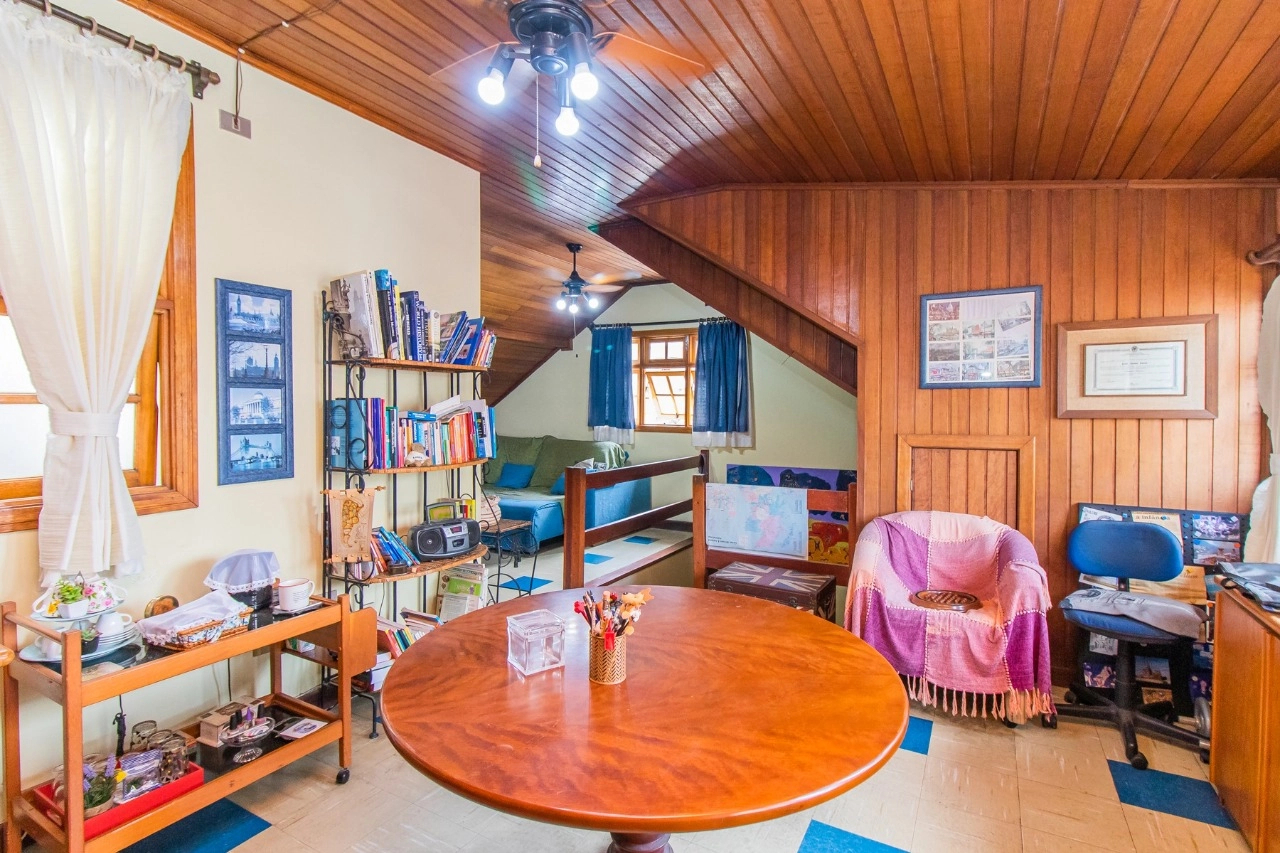 A residência de 4 pavimentos possui 3 dormitórios, sendo 1 suíte com closet, amplo living de 2 ambientes com lareira, churrasqueira, área externa, área intima de televisão no último andar, área de serviço espaçosa e garagem para 3 automóveis.