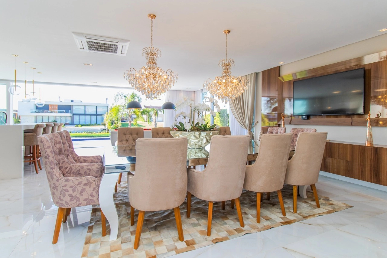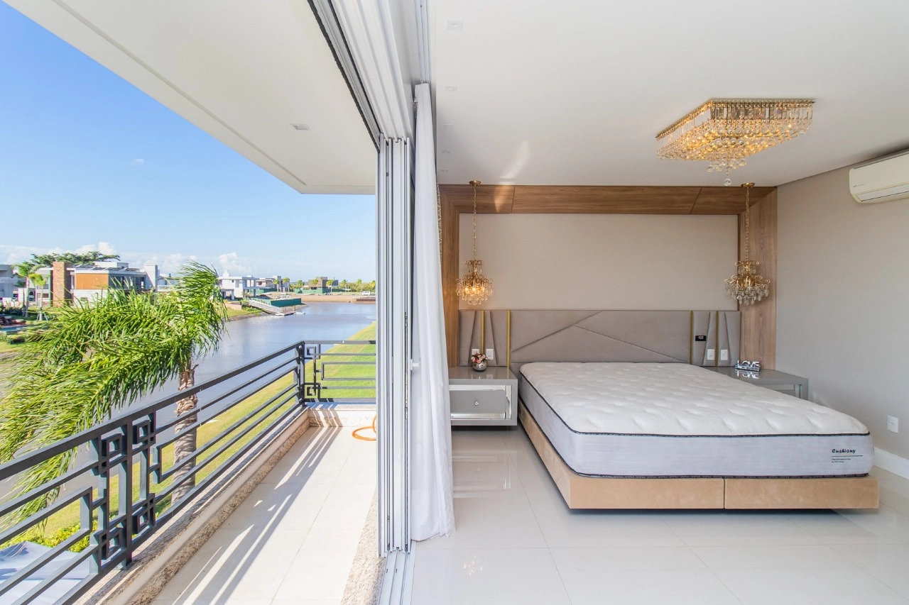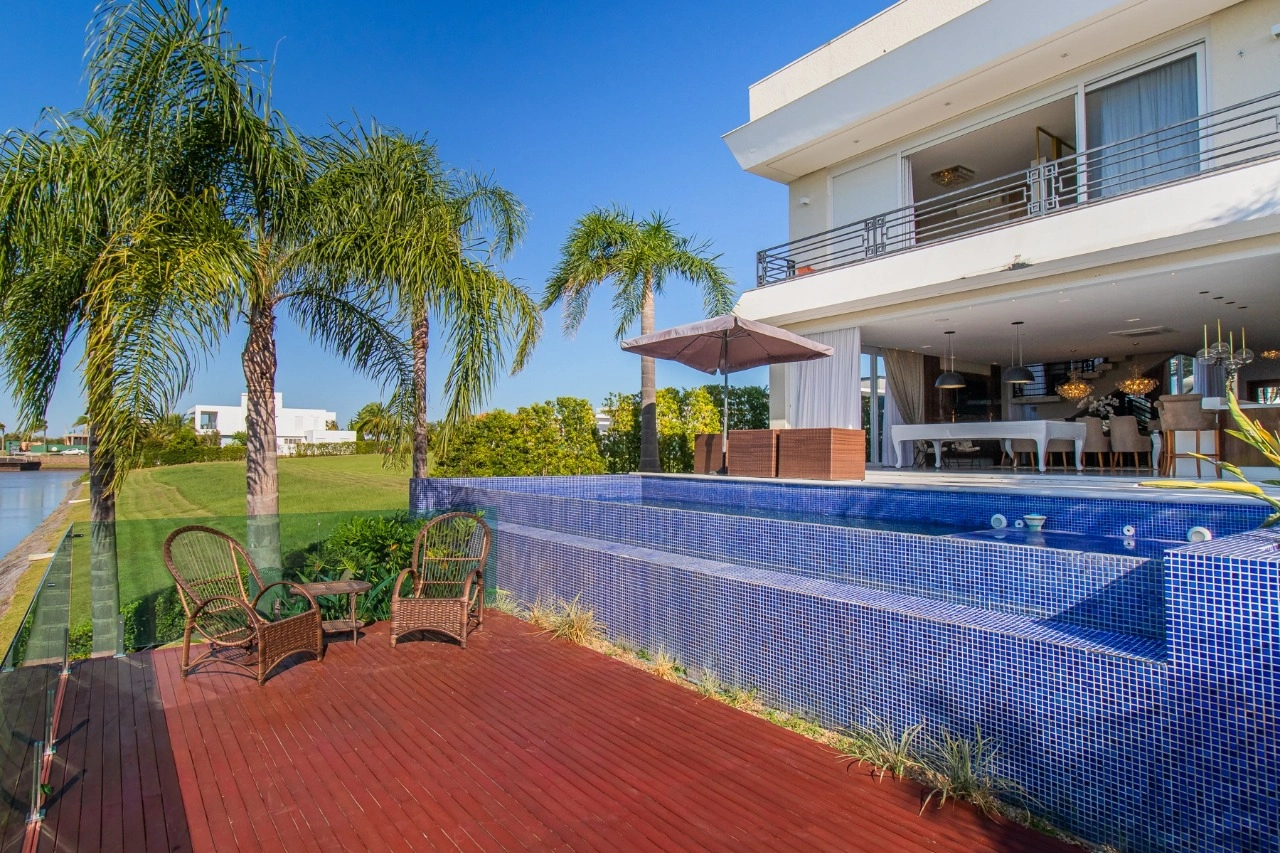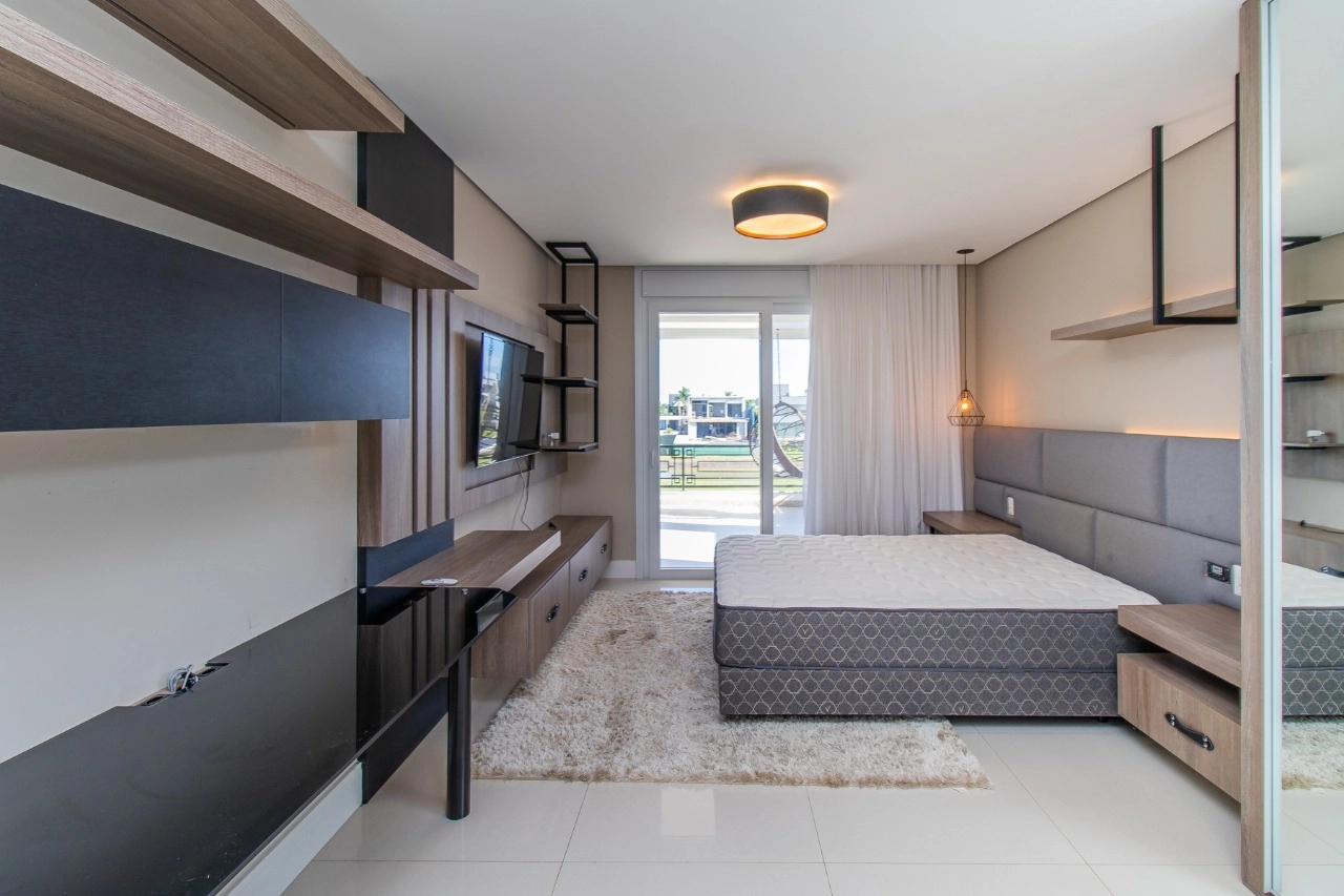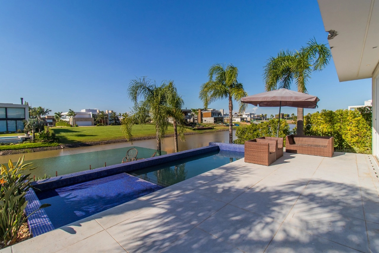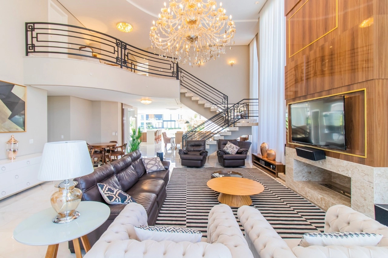Casa em condomínio, em lote molhado, 100% mobiliada, de 550 m², 4 dormitórios sendo 4 suítes, sendo uma suíte no andar inferior e três no andar superior. Suíte master com sacada e closet, banheiro ele e ela, living para 3 ambientes, com pé direito duplo, lavabo, lareira, sala de jantar, cozinha em conceito aberto, espaço goumert, com churrasqueira e deck com piscina.