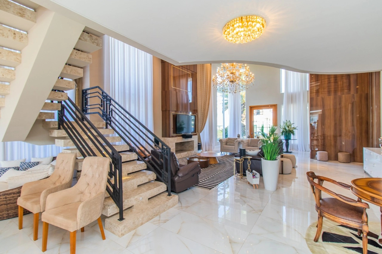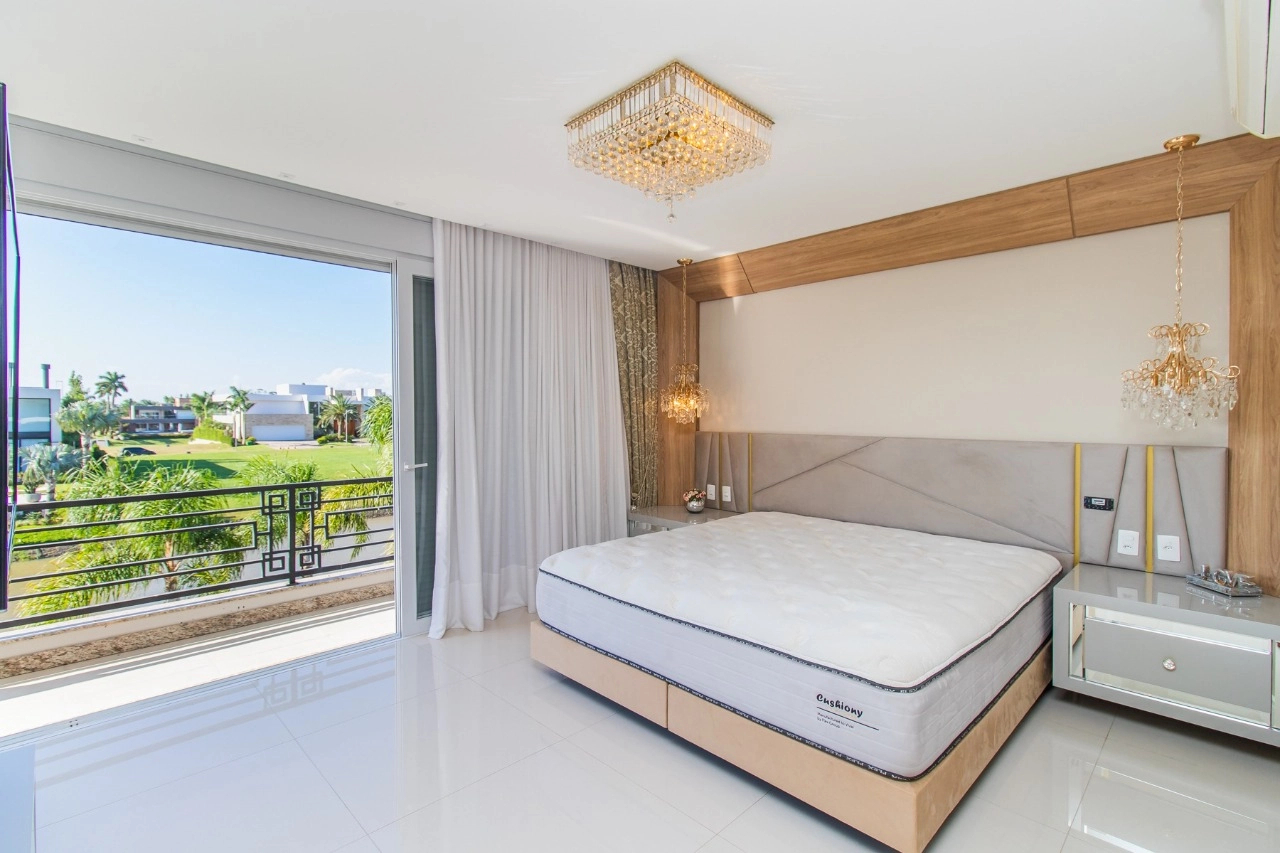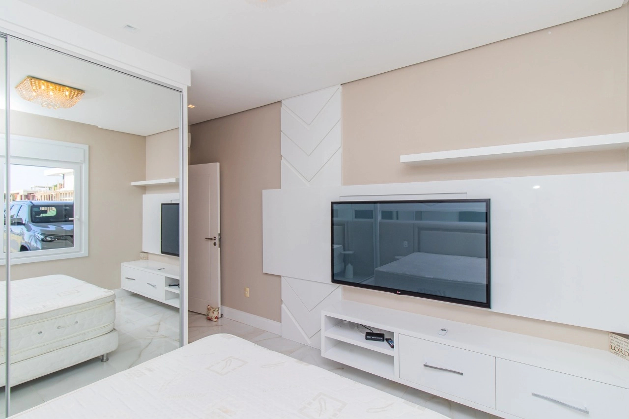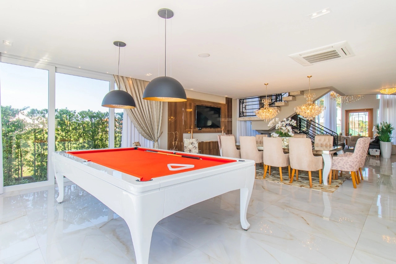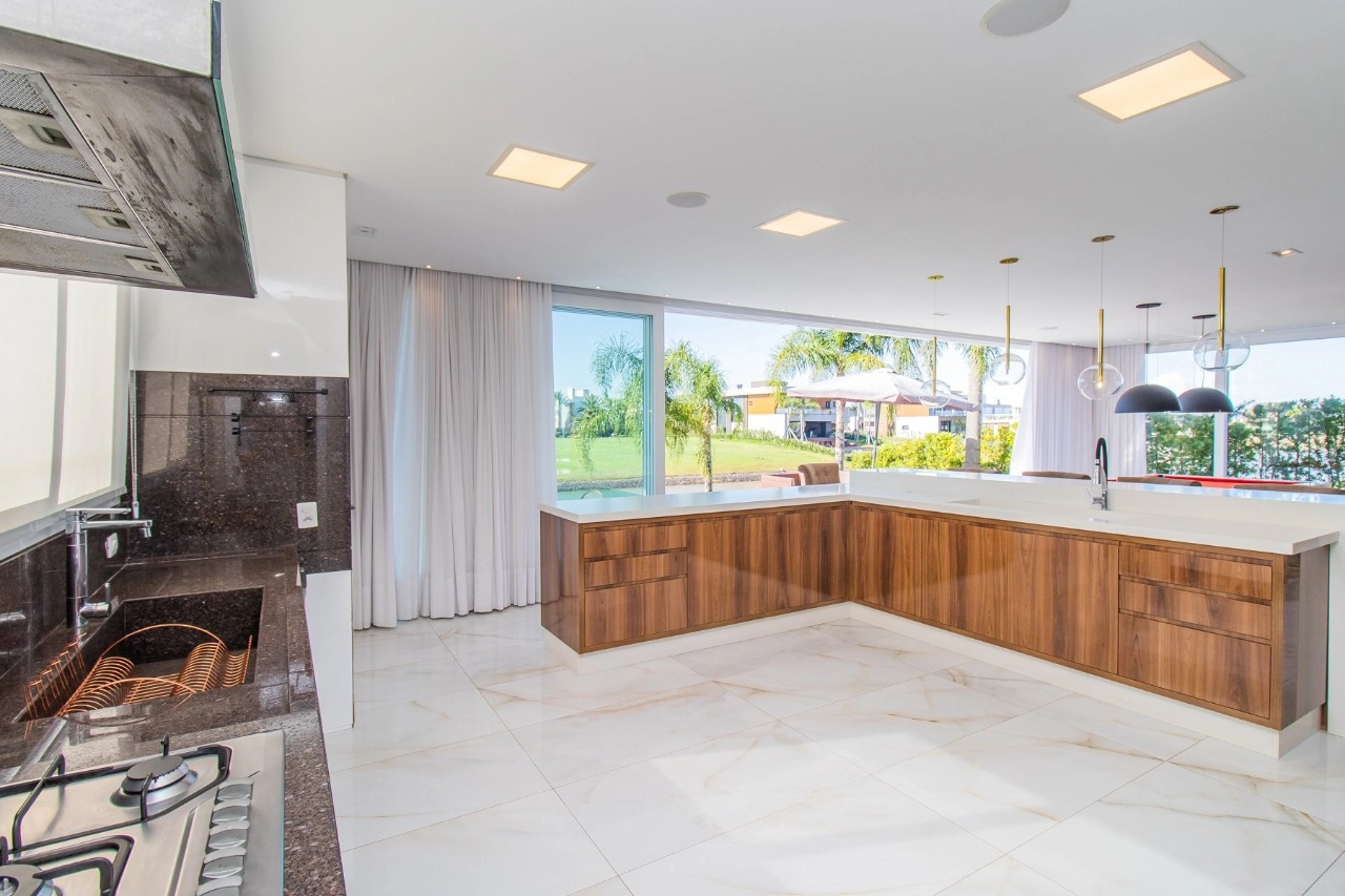 Casa em condomínio, em lote molhado, 100% mobiliada, de 550 m², 4 dormitórios sendo 4 suítes, sendo uma suíte no andar inferior e três no andar superior. Suíte master com sacada e closet, banheiro ele e ela, living para 3 ambientes, com pé direito duplo, lavabo, lareira, sala de jantar, cozinha em conceito aberto, espaço goumert, com churrasqueira e deck com piscina.