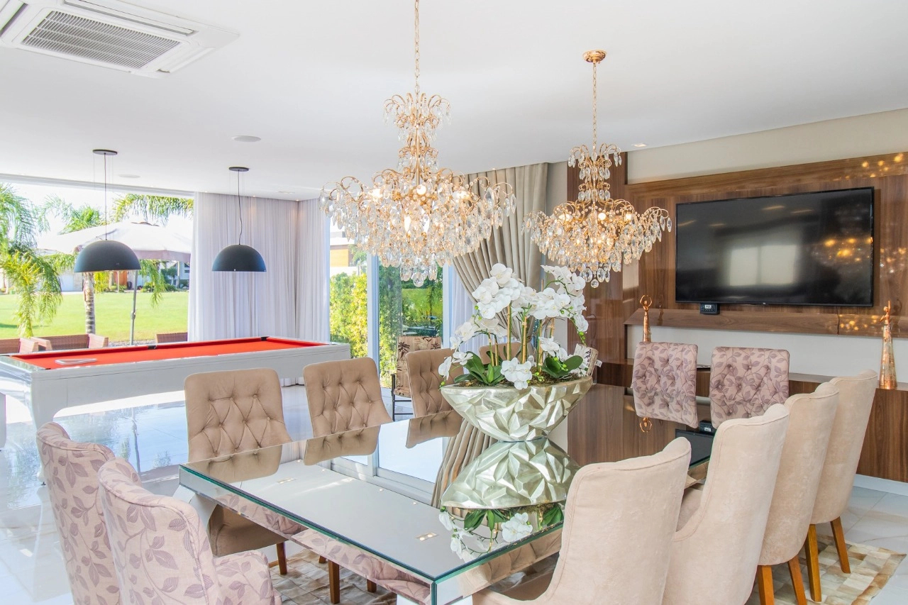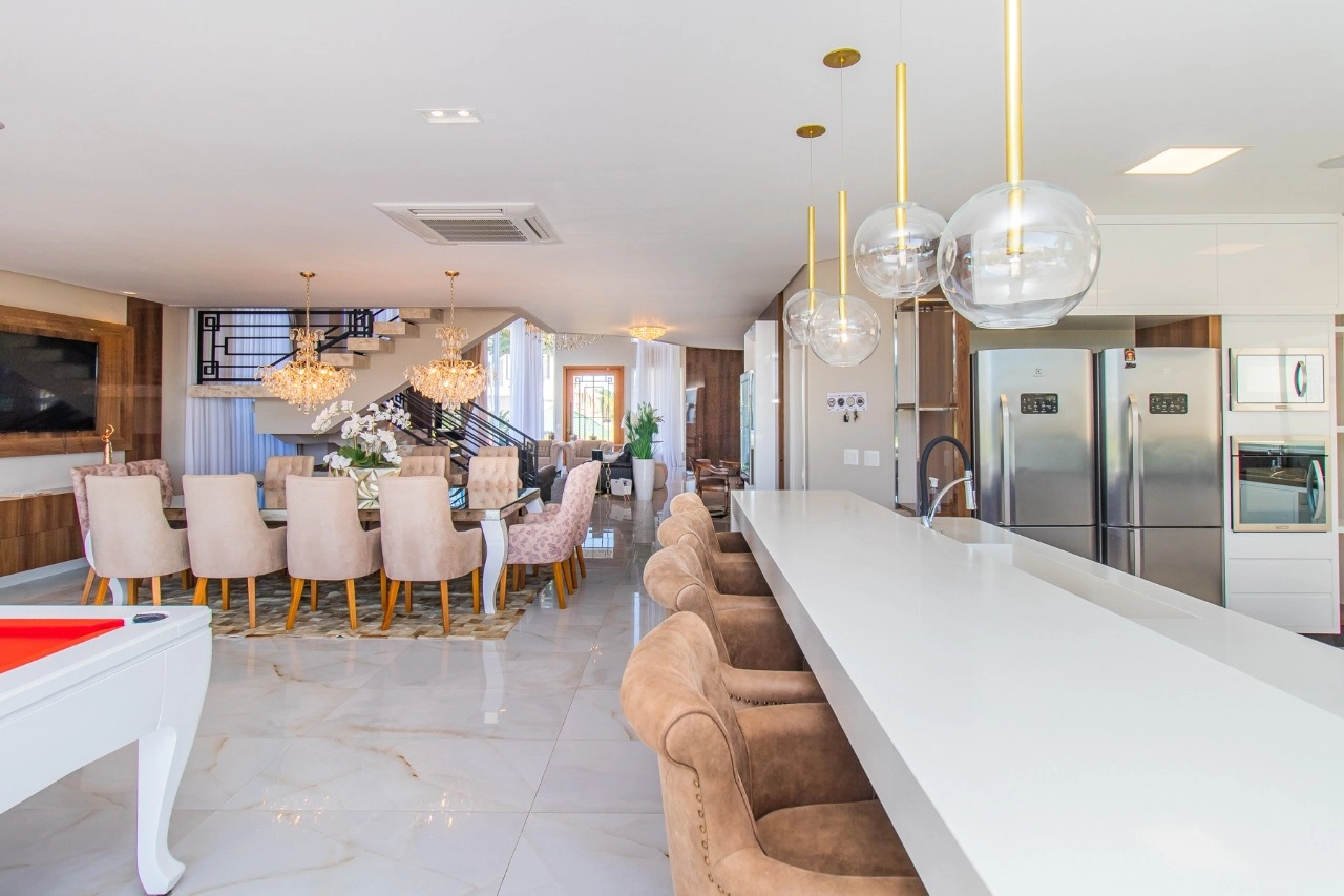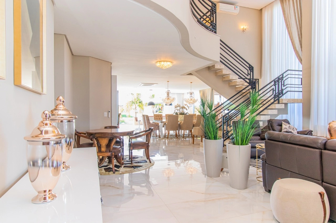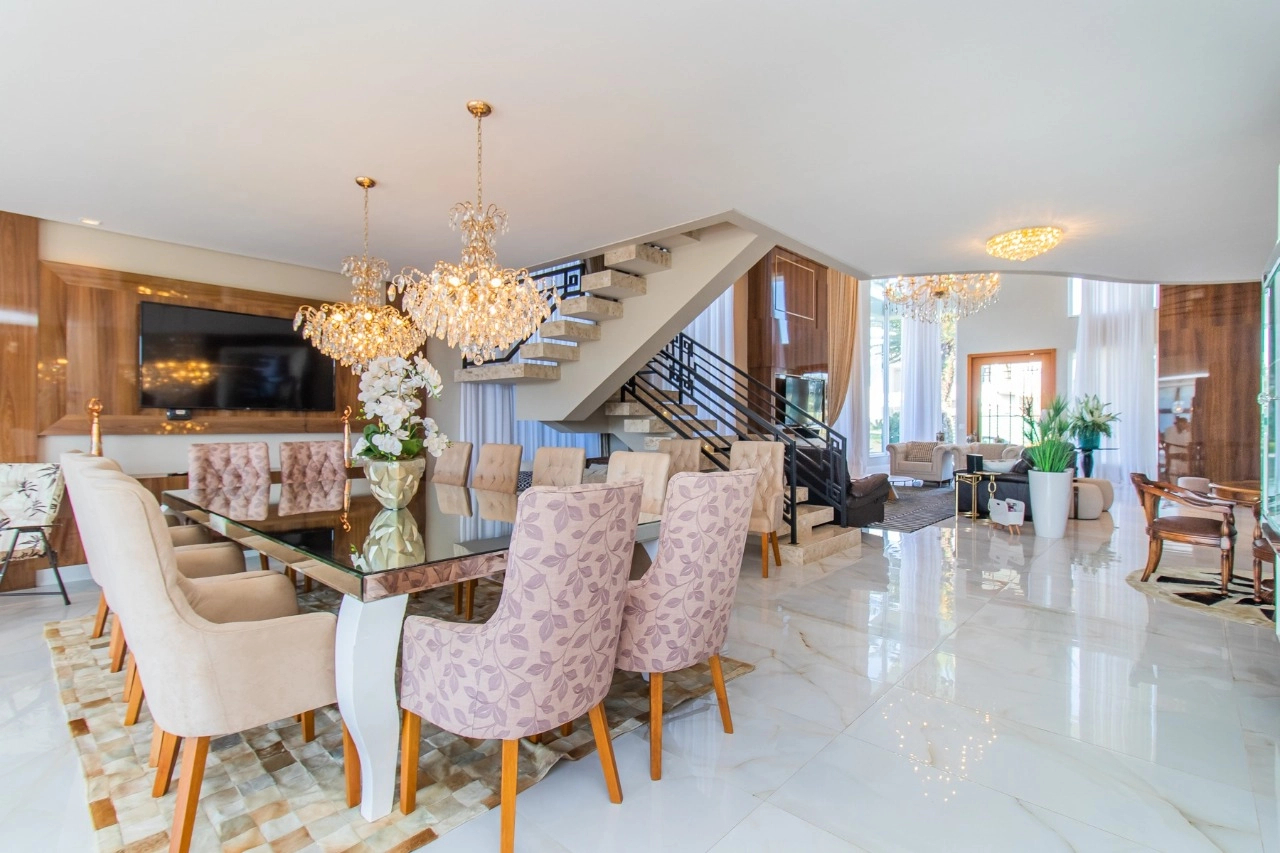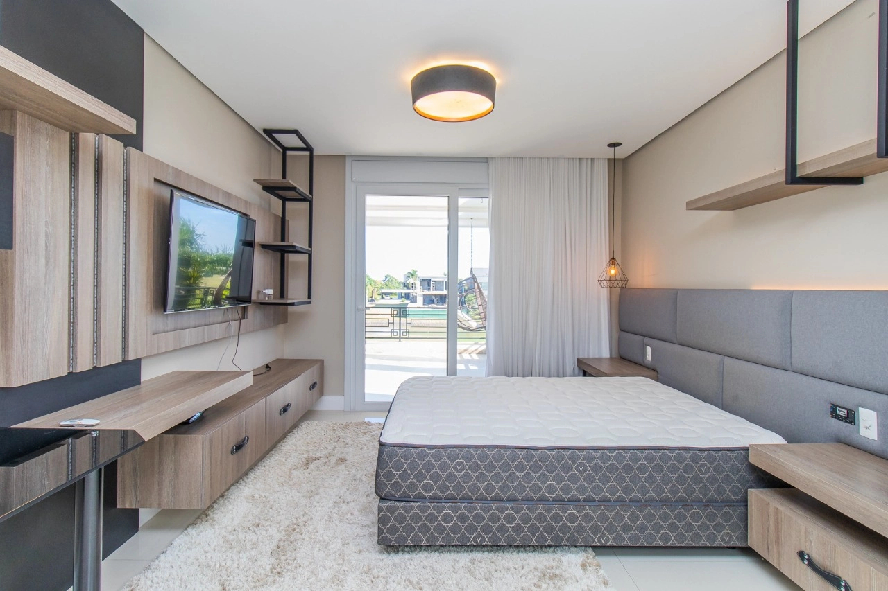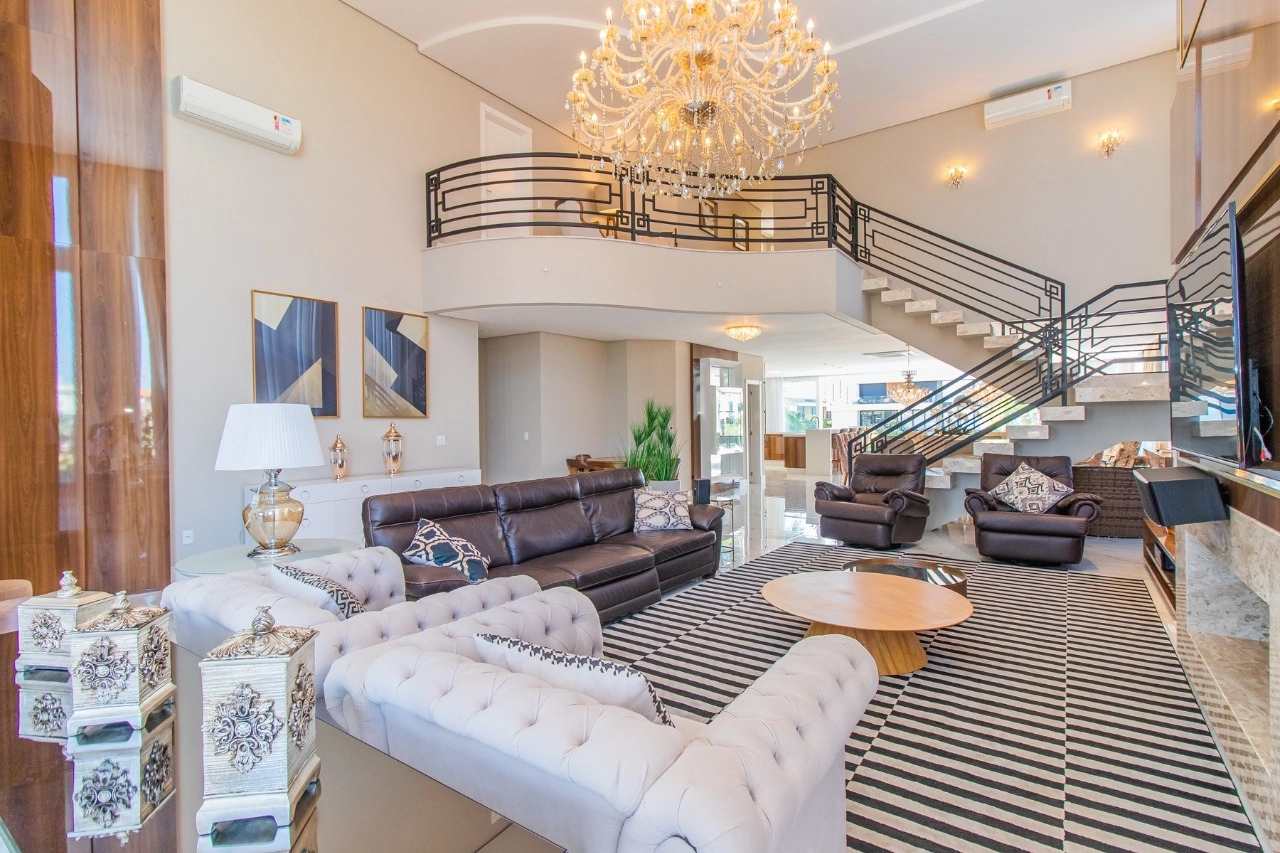 Casa em condomínio, em lote molhado, 100% mobiliada, de 550 m², 4 dormitórios sendo 4 suítes, sendo uma suíte no andar inferior e três no andar superior. Suíte master com sacada e closet, banheiro ele e ela, living para 3 ambientes, com pé direito duplo, lavabo, lareira, sala de jantar, cozinha em conceito aberto, espaço goumert, com churrasqueira e deck com piscina.