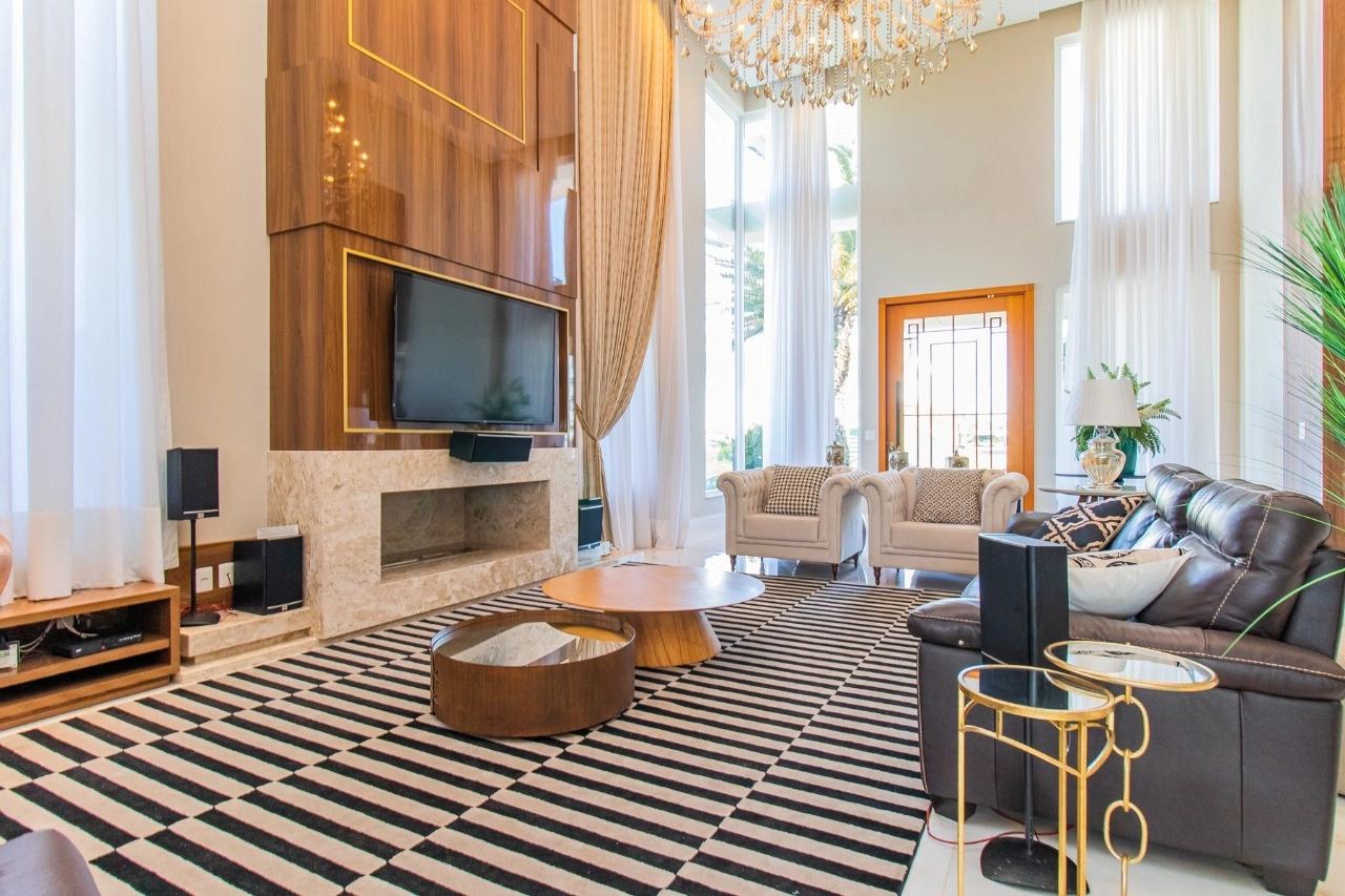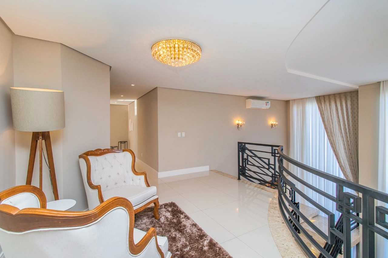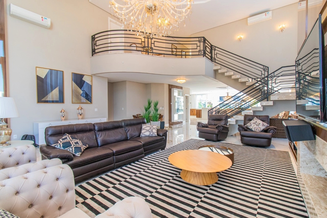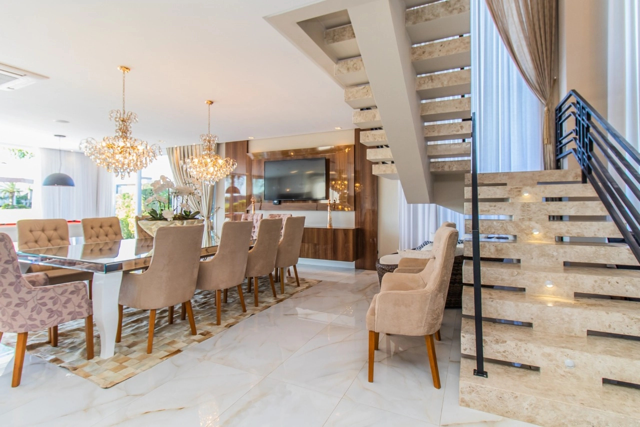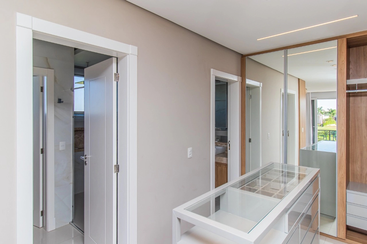 Casa em condomínio, em lote molhado, 100% mobiliada, de 550 m², 4 dormitórios sendo 4 suítes, sendo uma suíte no andar inferior e três no andar superior. Suíte master com sacada e closet, banheiro ele e ela, living para 3 ambientes, com pé direito duplo, lavabo, lareira, sala de jantar, cozinha em conceito aberto, espaço goumert, com churrasqueira e deck com piscina.