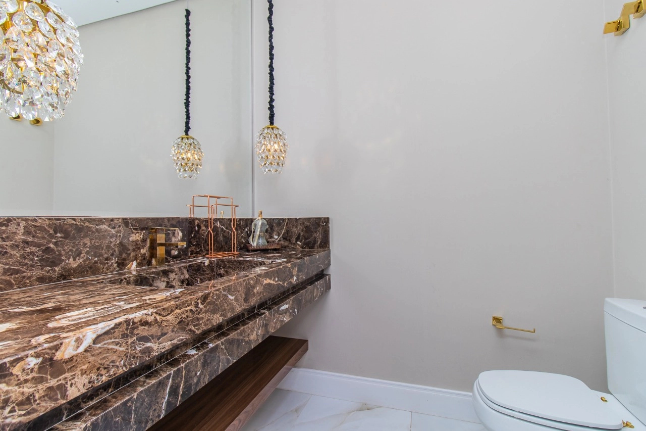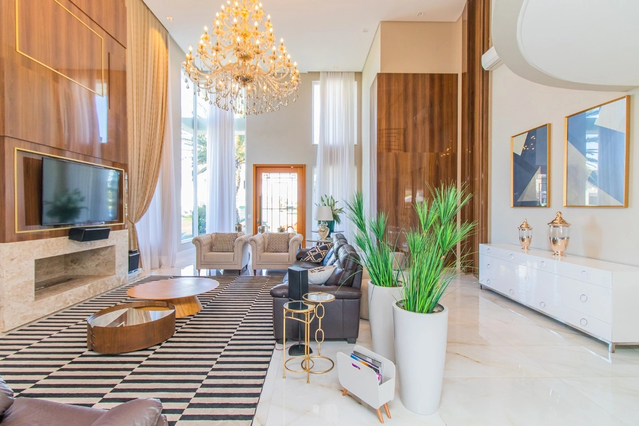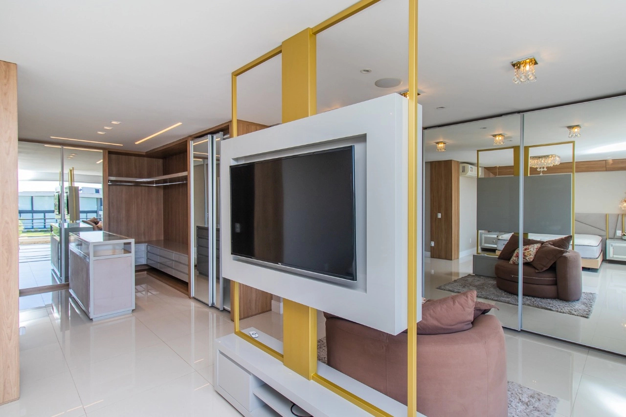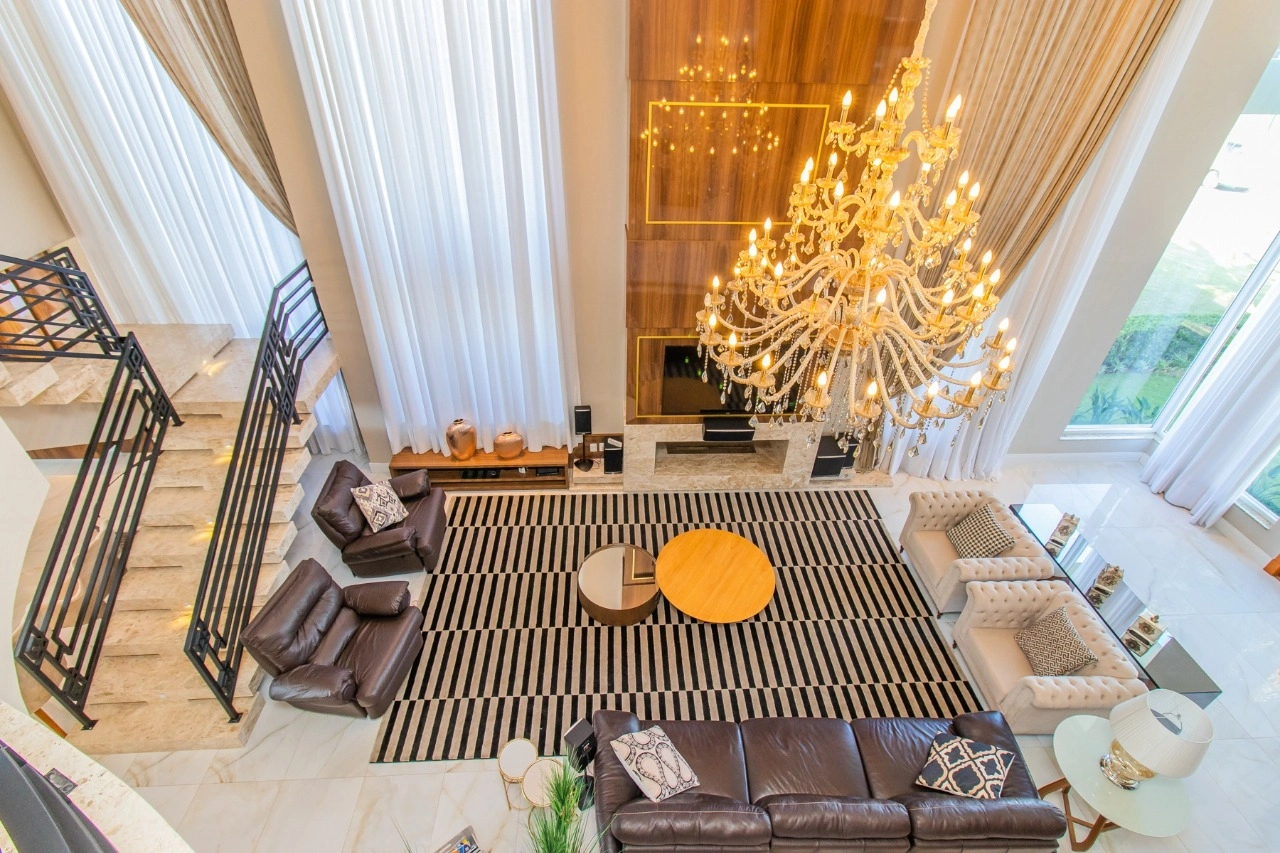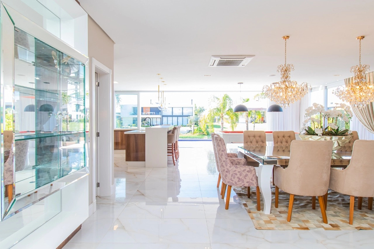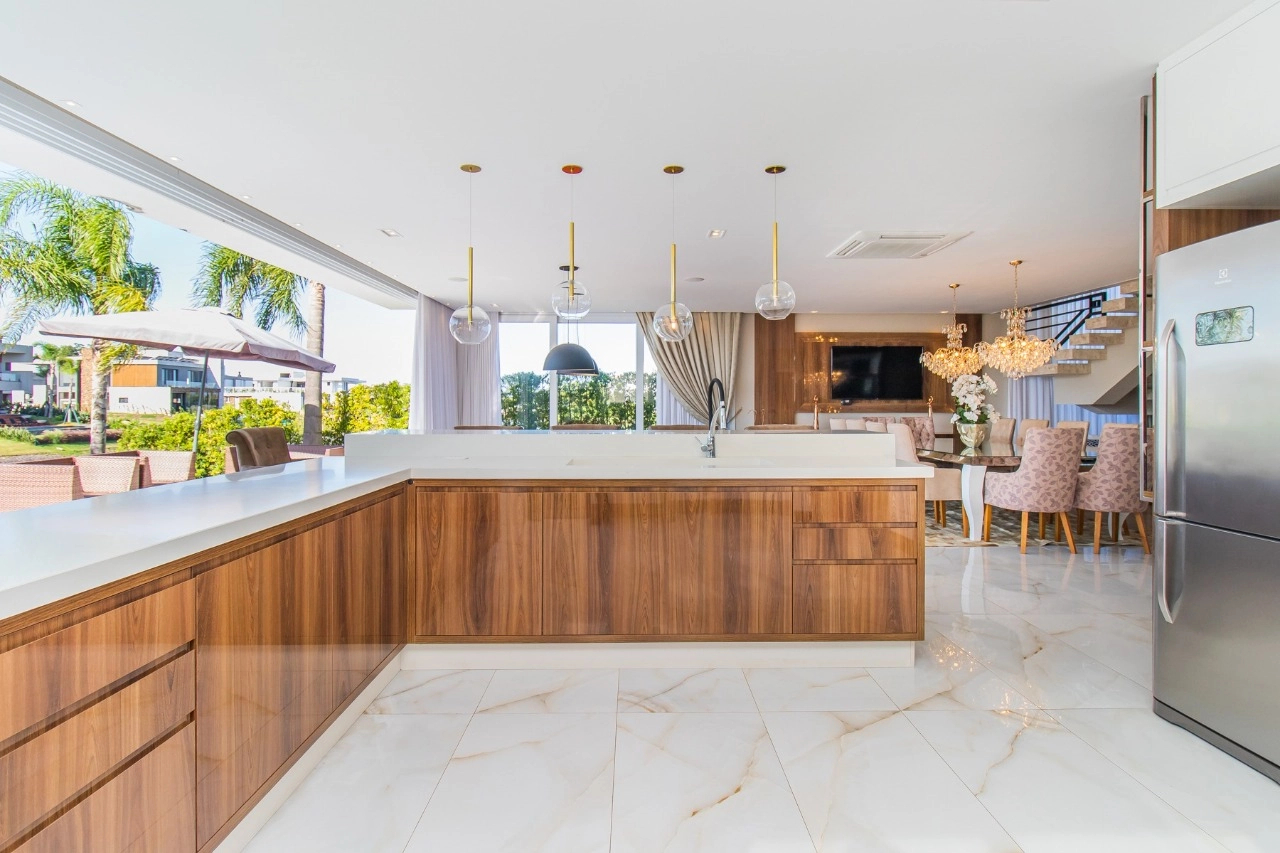 Casa em condomínio, em lote molhado, 100% mobiliada, de 550 m², 4 dormitórios sendo 4 suítes, sendo uma suíte no andar inferior e três no andar superior. Suíte master com sacada e closet, banheiro ele e ela, living para 3 ambientes, com pé direito duplo, lavabo, lareira, sala de jantar, cozinha em conceito aberto, espaço goumert, com churrasqueira e deck com piscina.