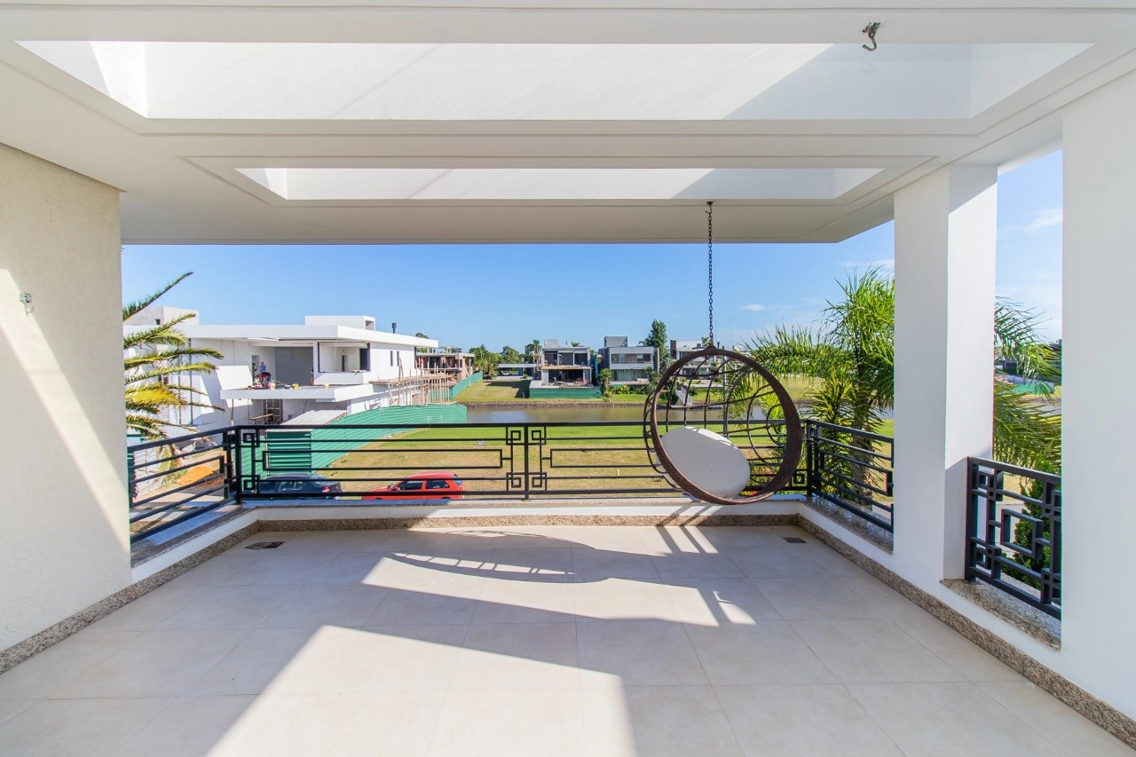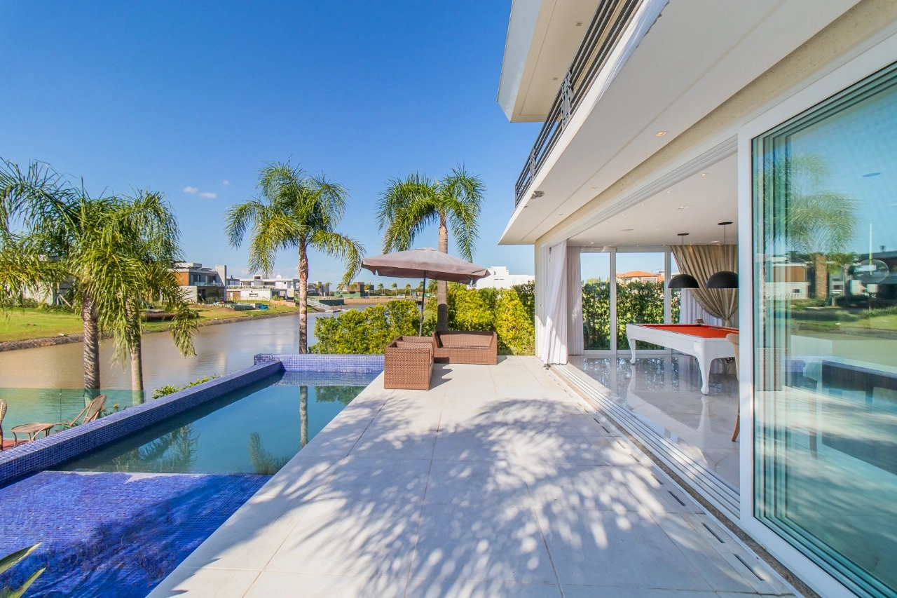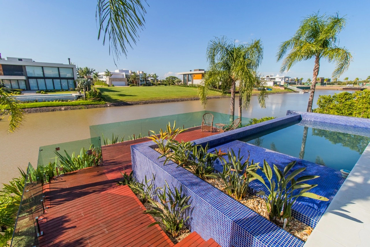 Condomínio com infraestrutura de clube: restaurante, pub, sala de cinema, brinquedoteca, espaço fitness, jardim, piscinas adulto e infantil, piscina com raias, piscina térmica, playground, quadra de futebol, quadra paddle, quadra poliesportiva, quadra de tênis, salão de festas, sauna, gás central condominial, circuito de tv, segurança e portaria 24 horas, marina e serviço pay-per-use.