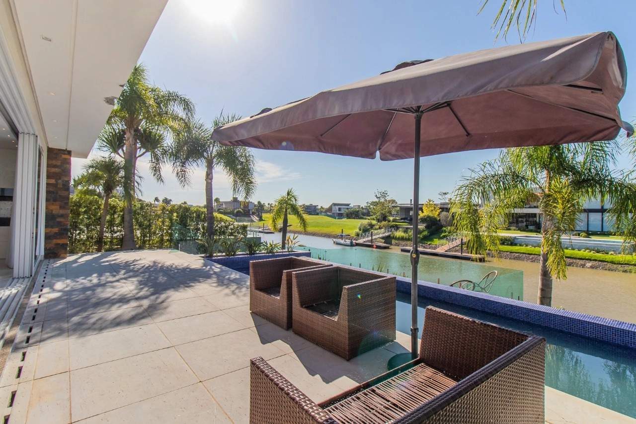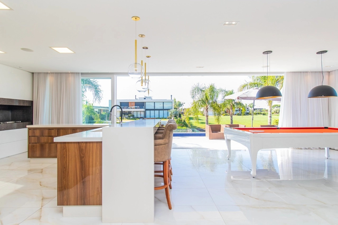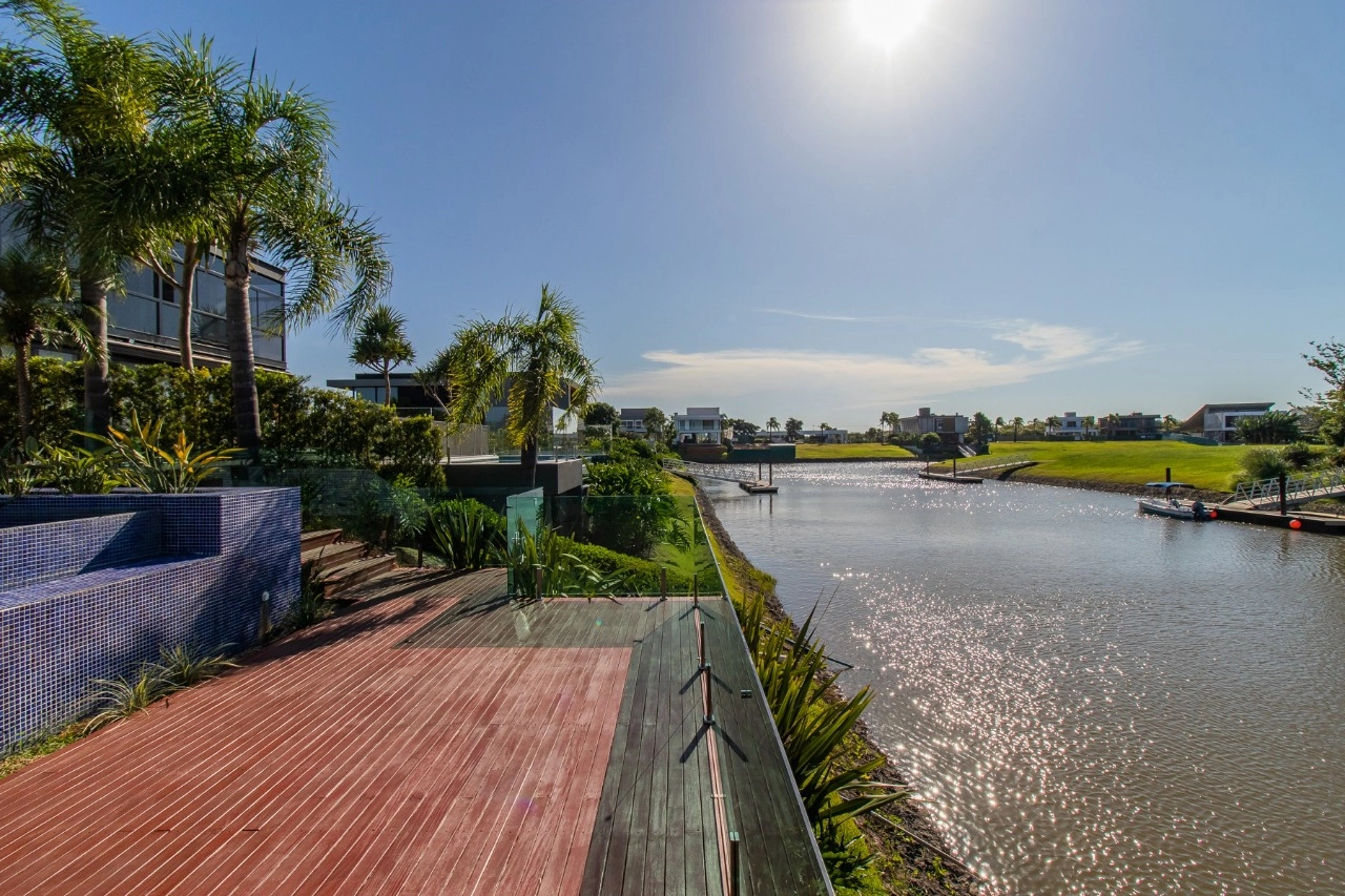 Condomínio com infraestrutura de clube: restaurante, pub, sala de cinema, brinquedoteca, espaço fitness, jardim, piscinas adulto e infantil, piscina com raias, piscina térmica, playground, quadra de futebol, quadra paddle, quadra poliesportiva, quadra de tênis, salão de festas, sauna, gás central condominial, circuito de tv, segurança e portaria 24 horas, marina e serviço pay-per-use.
