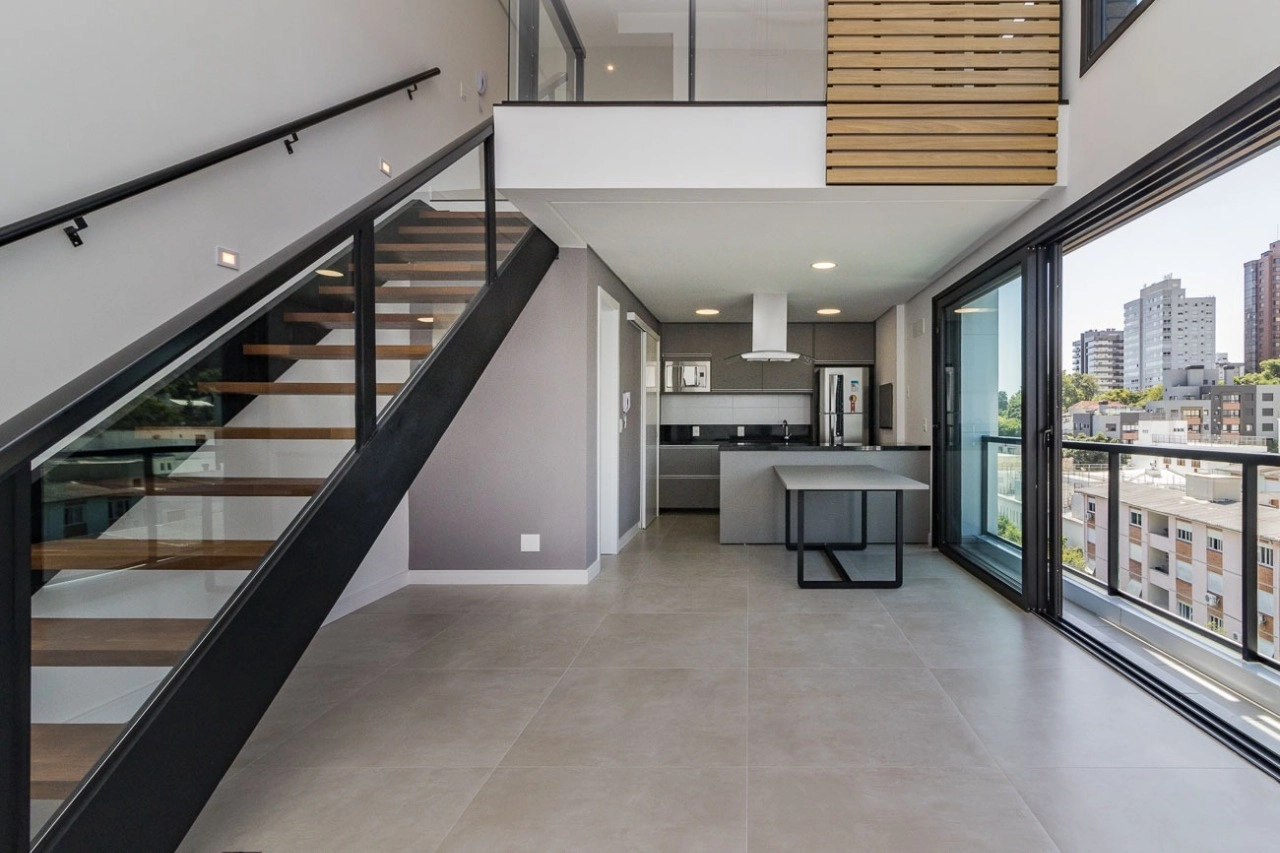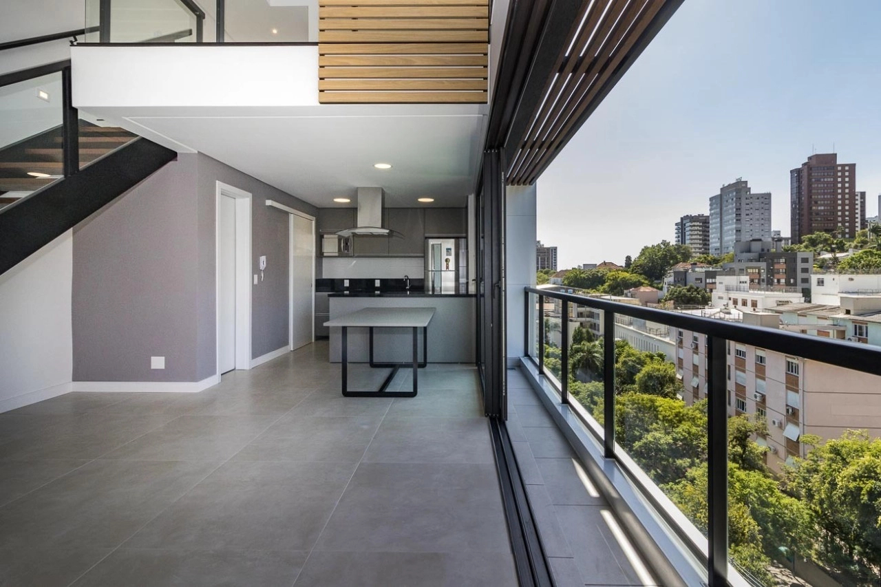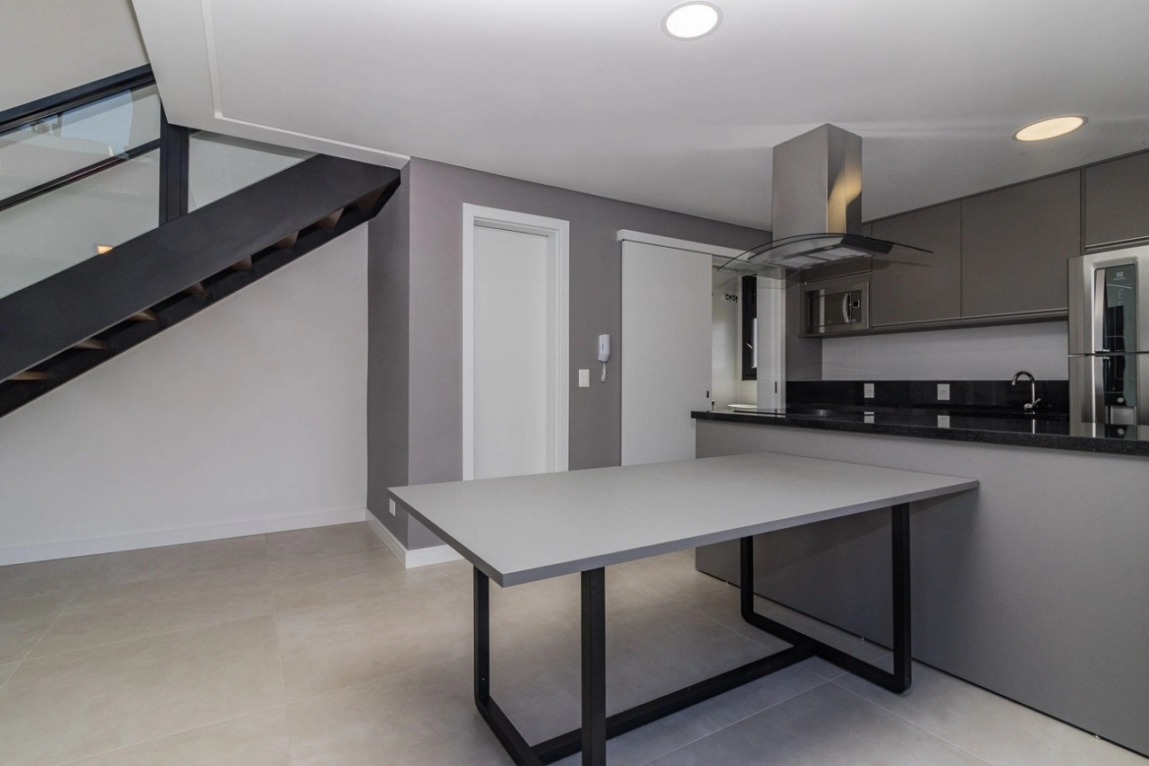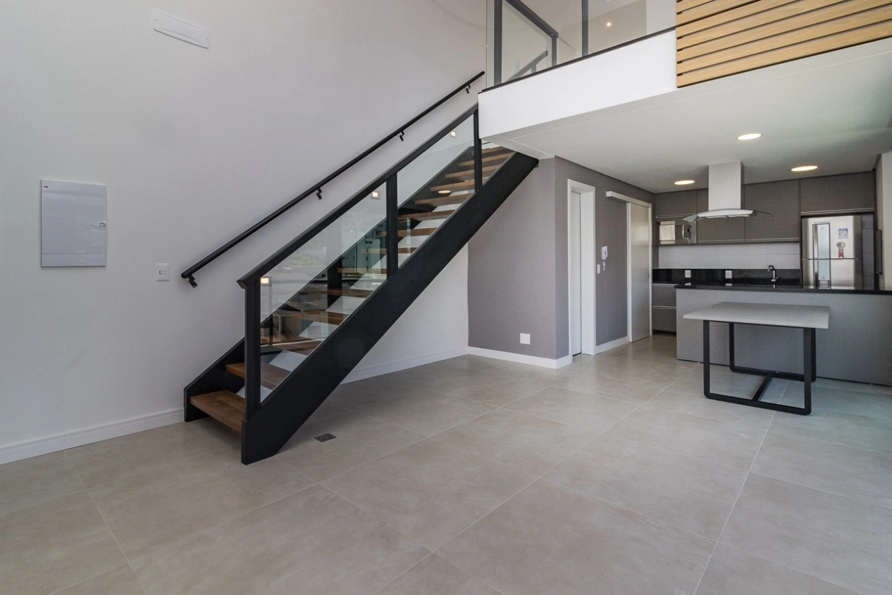 Apartamento duplex de 76 m² de área privativa, 1 suíte, living para 2 ambientes com sacada, lavabo, cozinha com churrasqueira e área de serviço separada. Possui 2 vagas de garagem e depósito.