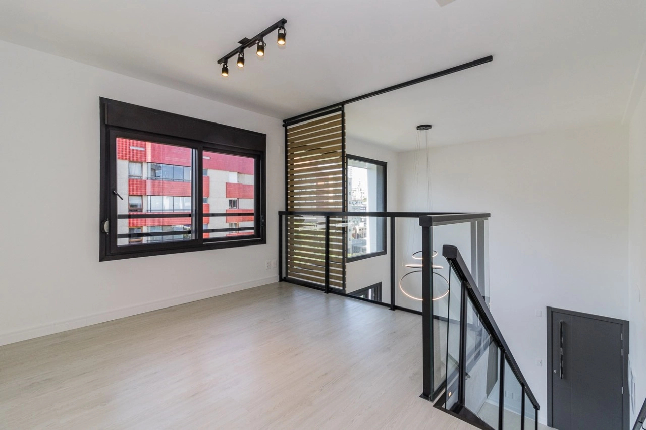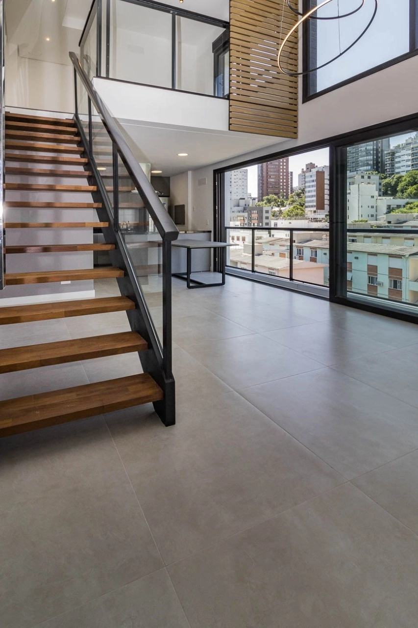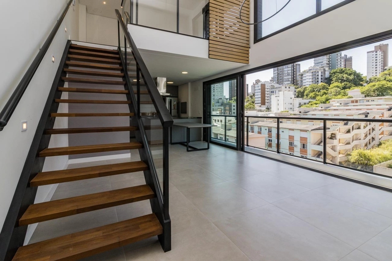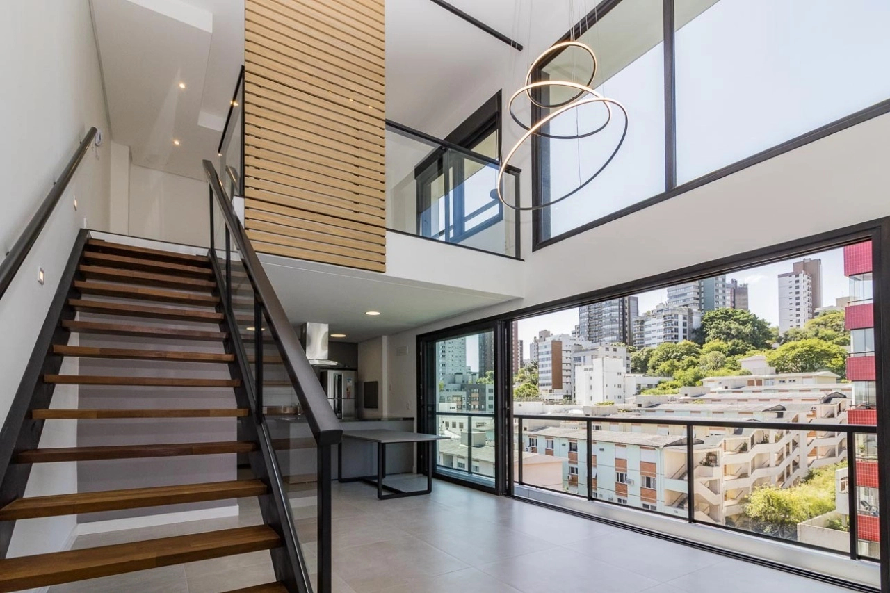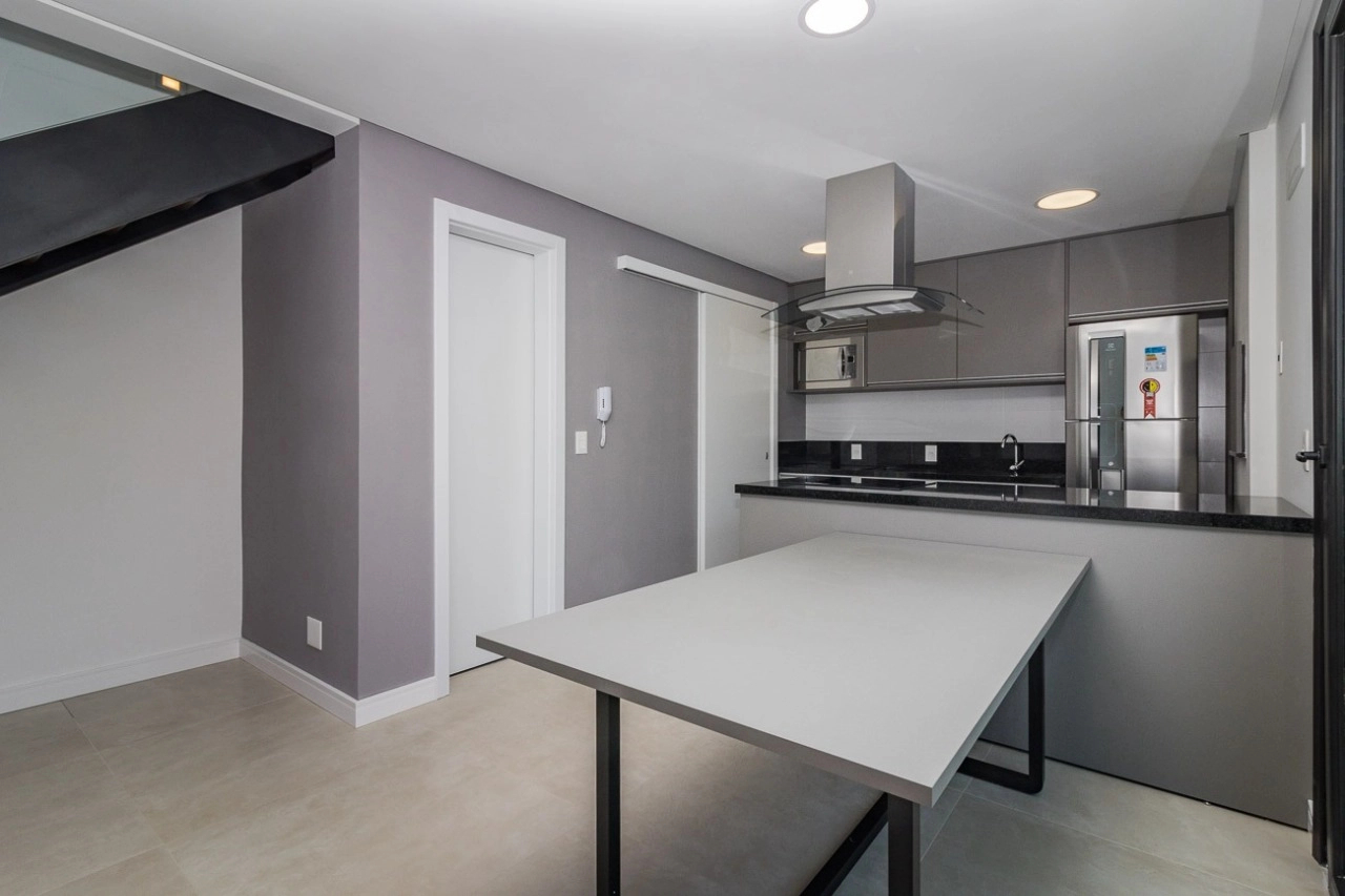 Apartamento duplex de 76 m² de área privativa, 1 suíte, living para 2 ambientes com sacada, lavabo, cozinha com churrasqueira e área de serviço separada. Possui 2 vagas de garagem e depósito.
