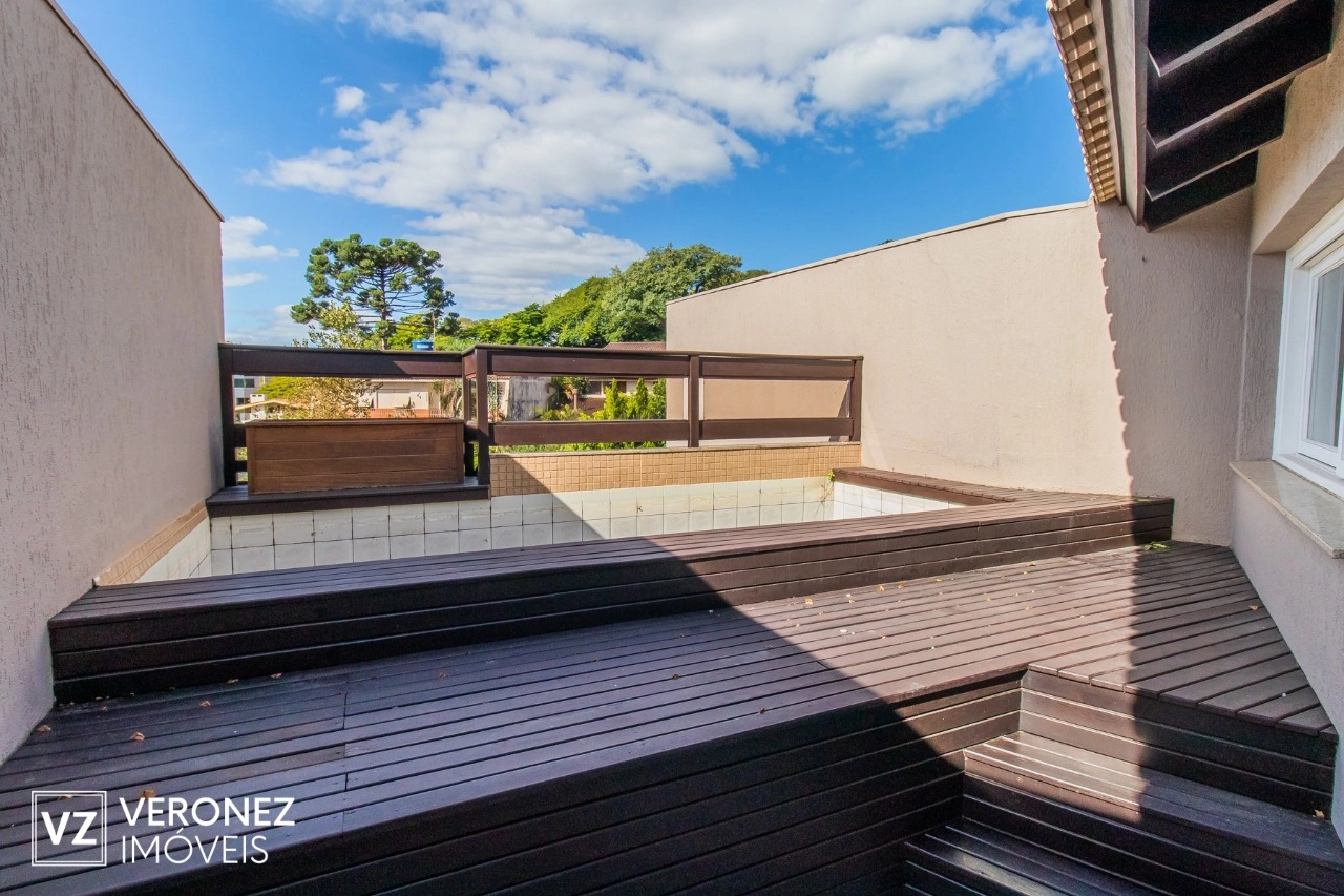 O imóvel possui 4 pavimentos, sendo no primeiro uma ampla garagem com área de serviço, no segundo uma espaçosa sala com lareira, churrasqueira e cozinha americana, no terceiro ficam os 3 dormitórios incluindo uma suíte master com closet e banheira e no último pavimento uma ampla sala com lavabo e a piscina.
