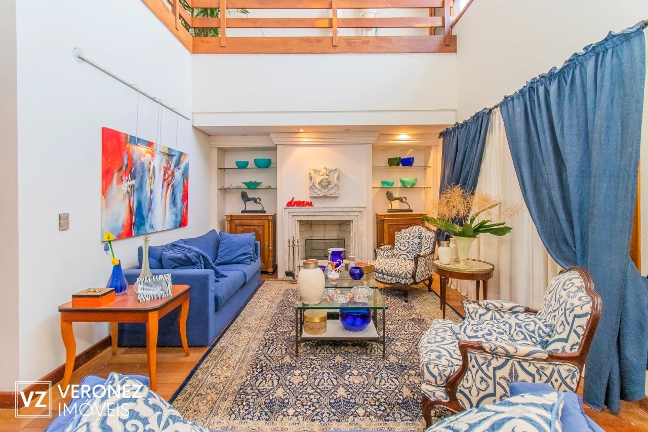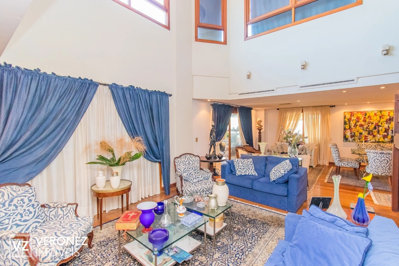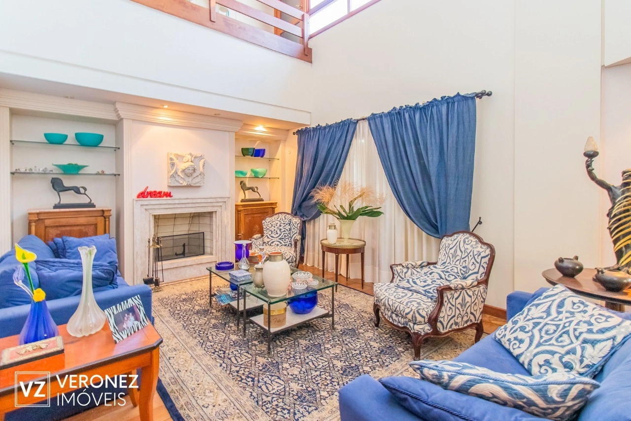 No primeiro pavimento, um living incrível com pé direito duplo, lareira e sacada em toda sua extensão podendo ser integrada. Cozinha, área de serviço e dependência de empregada completa. 2 suítes, 1 dormitório e mais um gabinete.