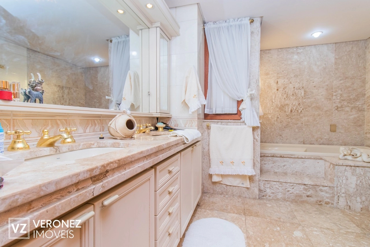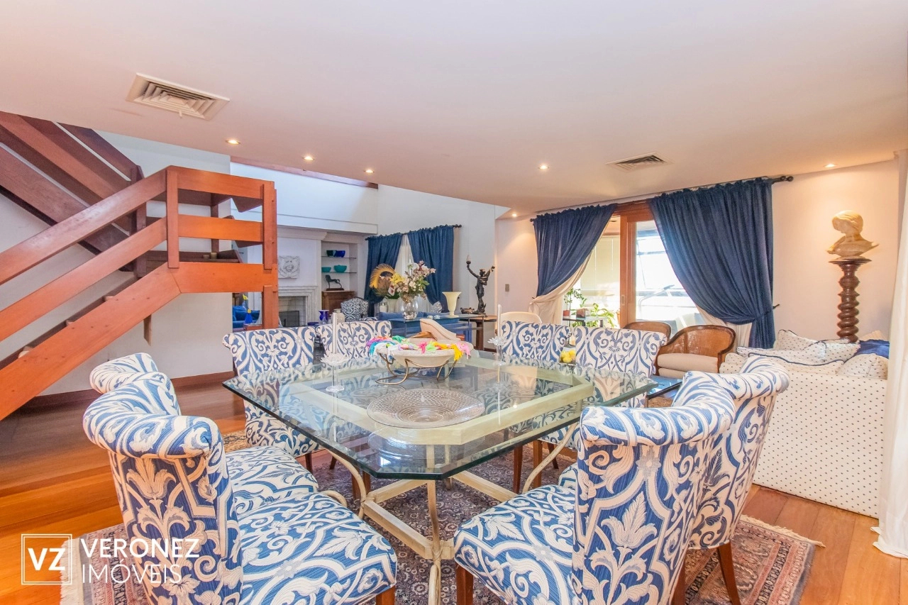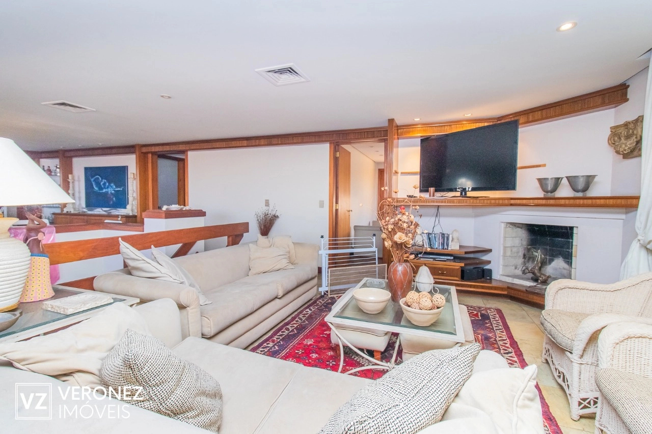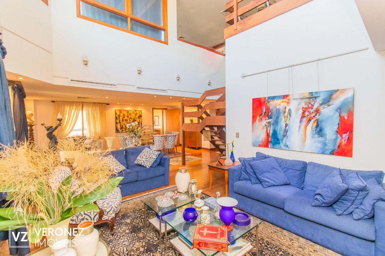 No primeiro pavimento, um living incrível com pé direito duplo, lareira e sacada em toda sua extensão podendo ser integrada. Cozinha, área de serviço e dependência de empregada completa. 2 suítes, 1 dormitório e mais um gabinete.