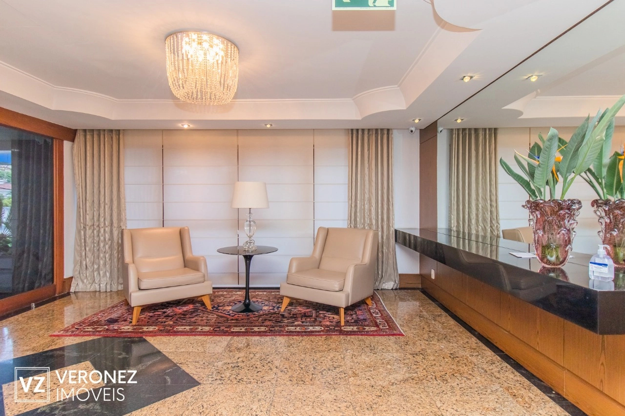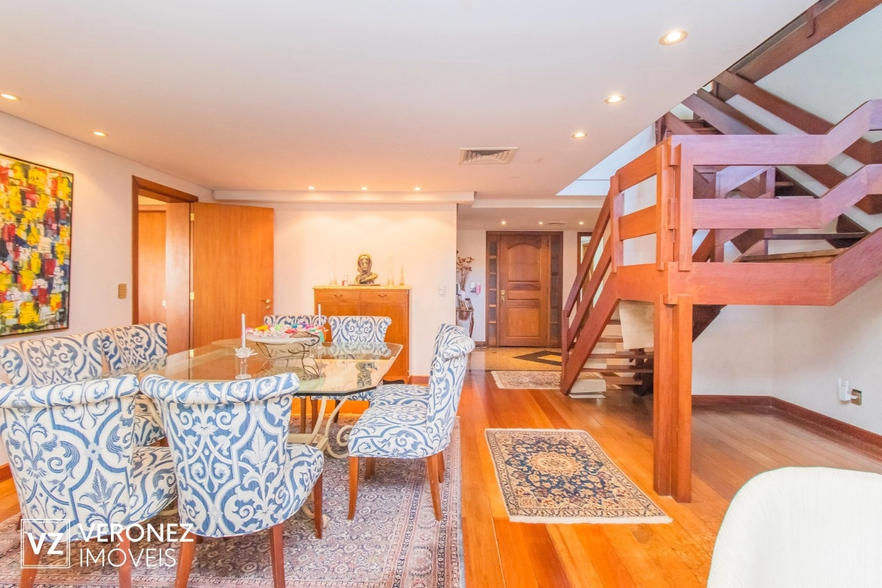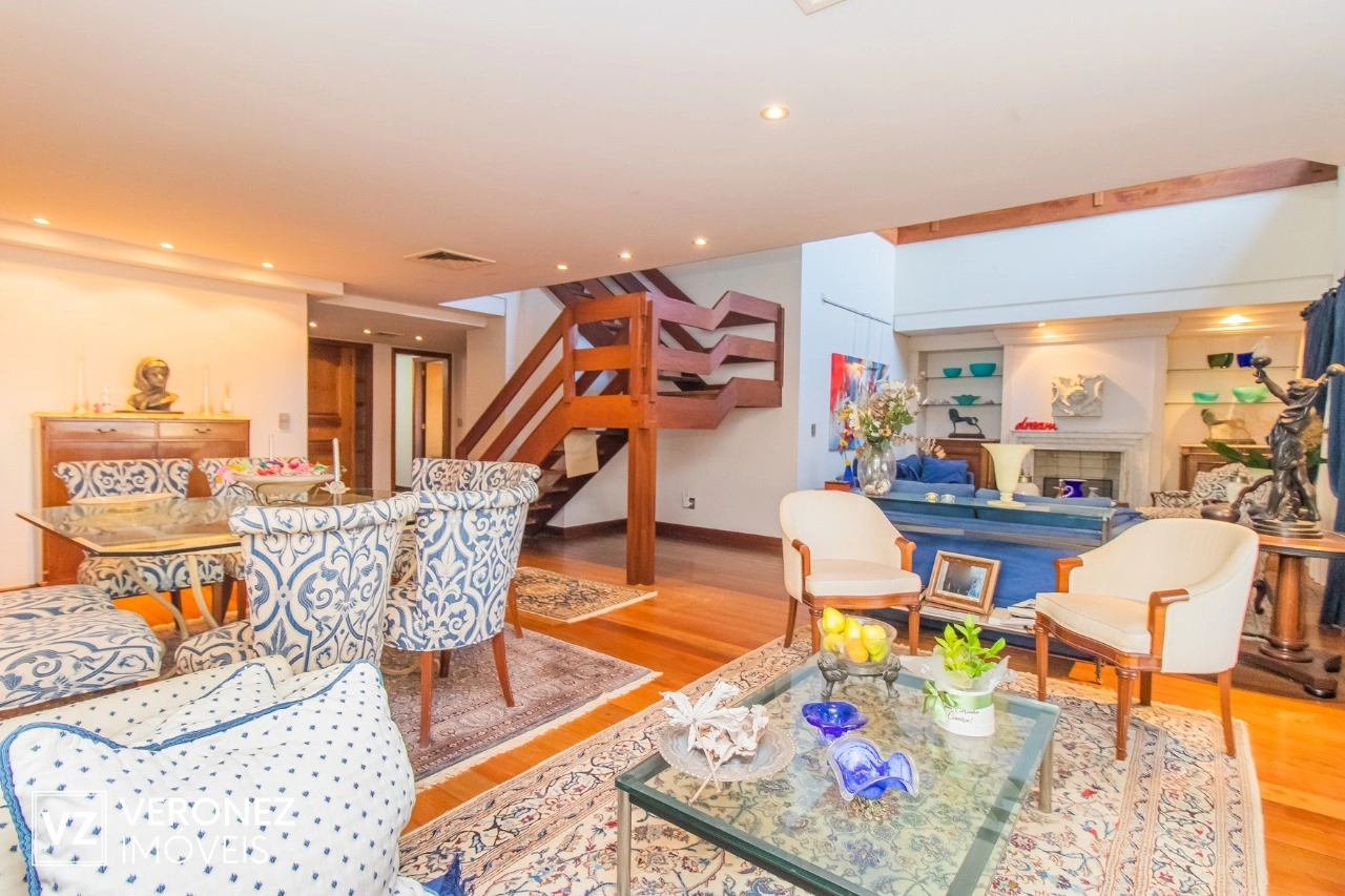 Com 5 dormitórios (duas suítes), hall social privativo, sendo um apartamento por andar e 3 vagas de garagem, ar central, espera para sauna seca e central telefônica.