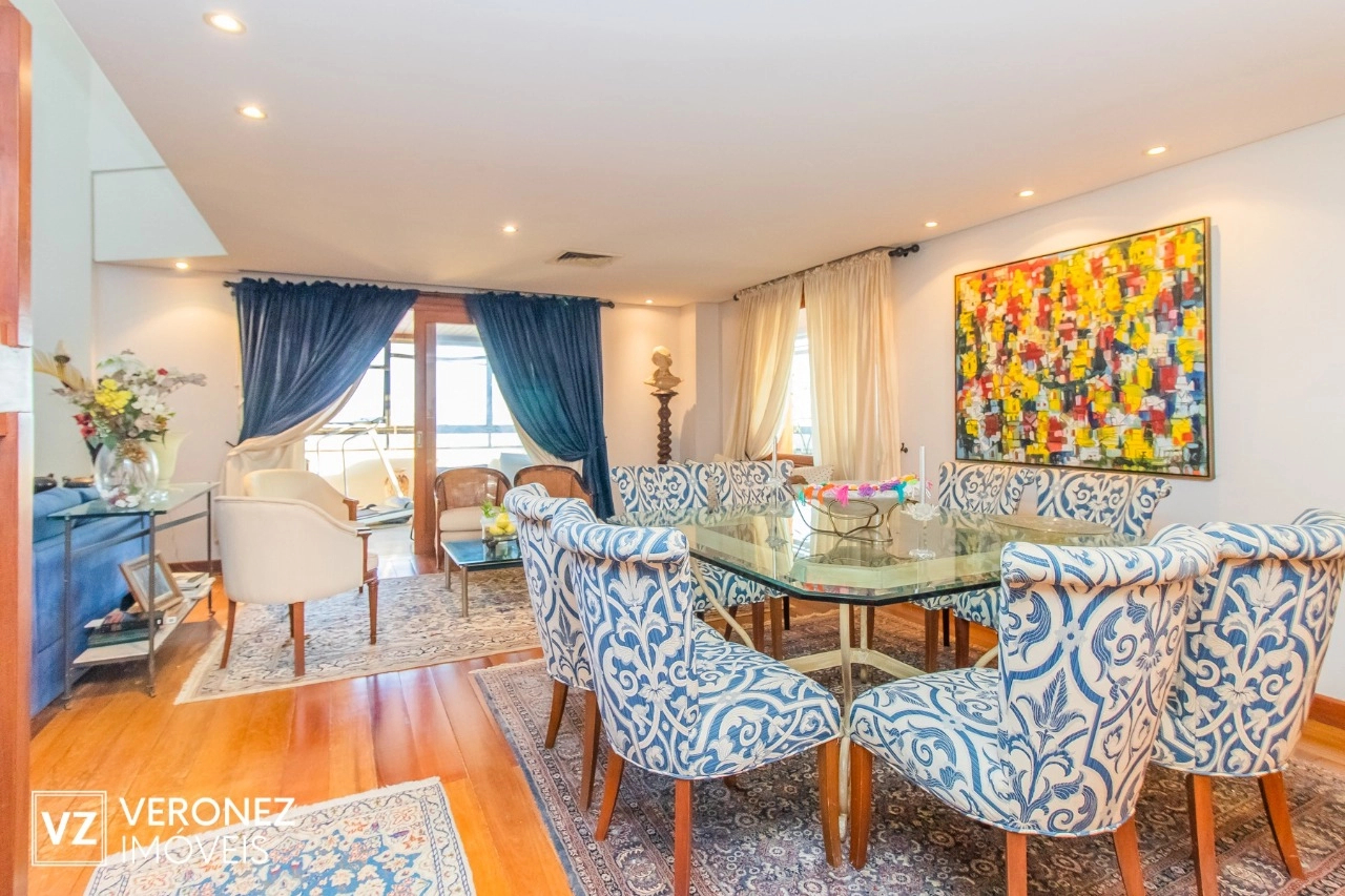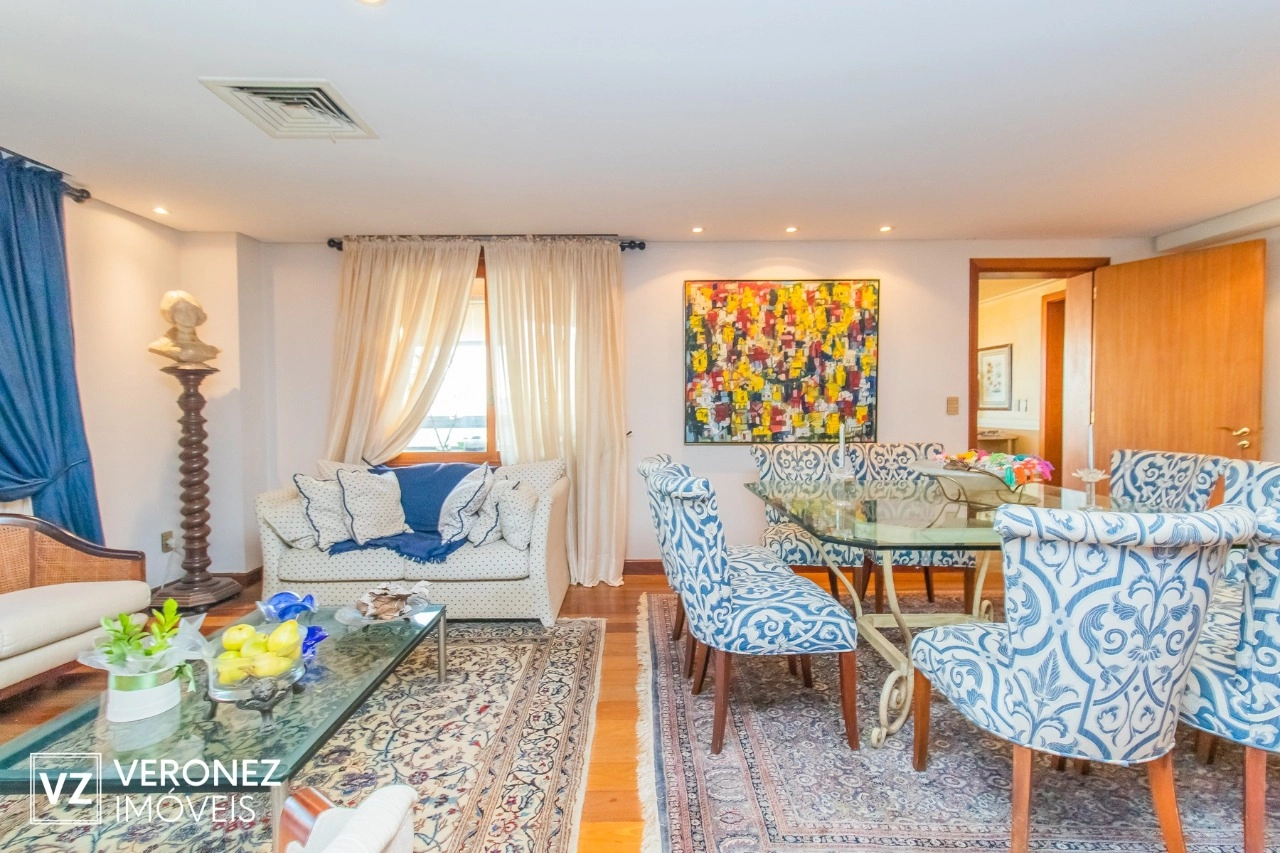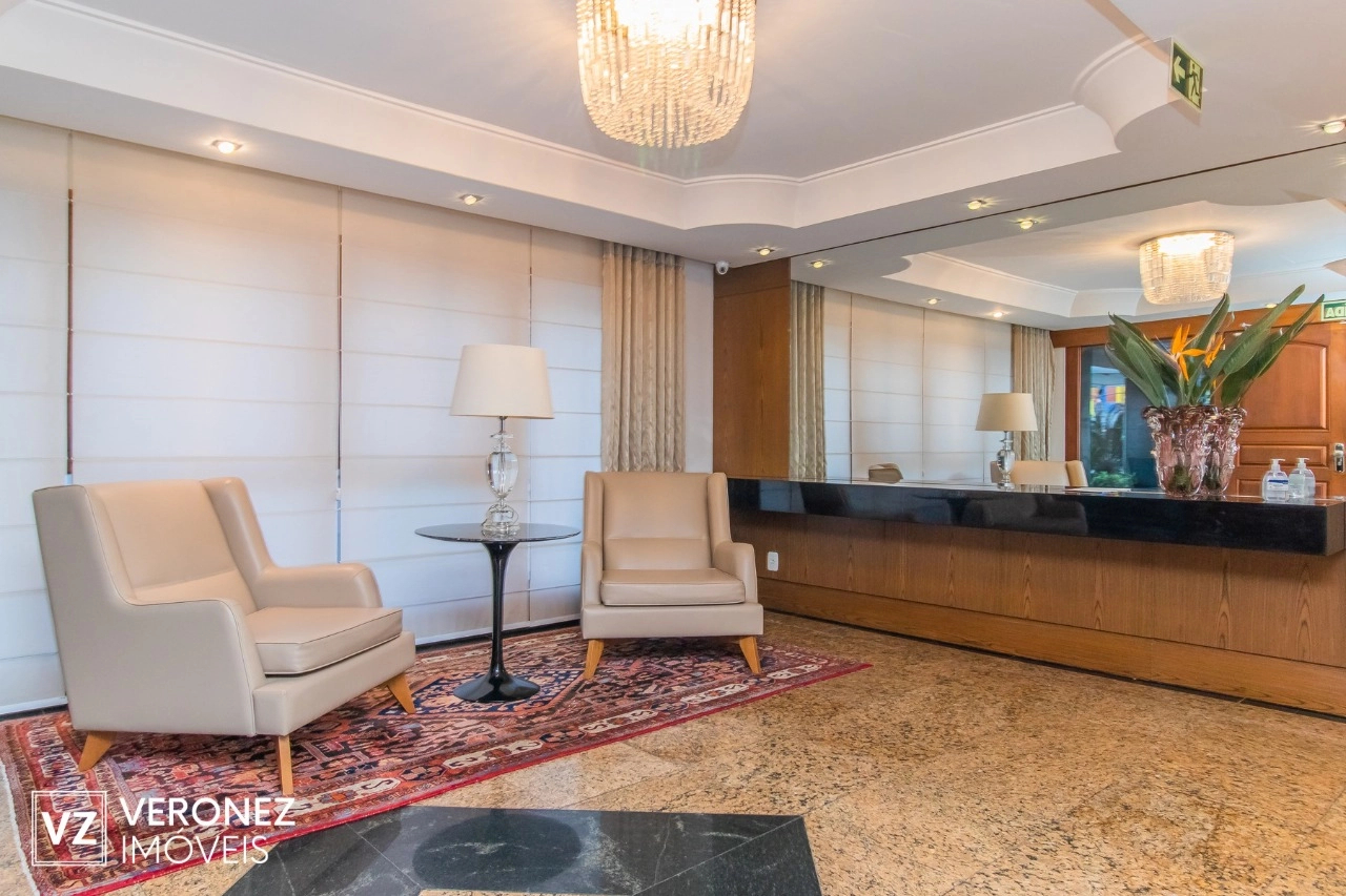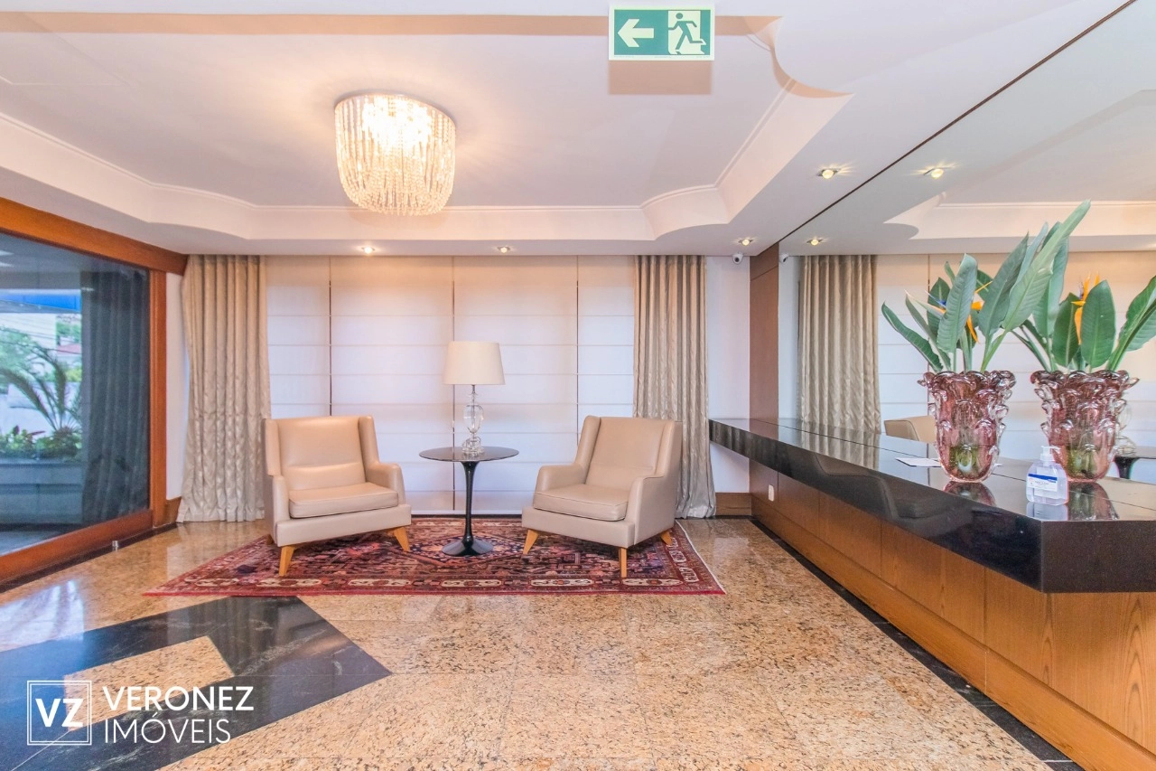 Com 5 dormitórios (duas suítes), hall social privativo, sendo um apartamento por andar e 3 vagas de garagem, ar central, espera para sauna seca e central telefônica.