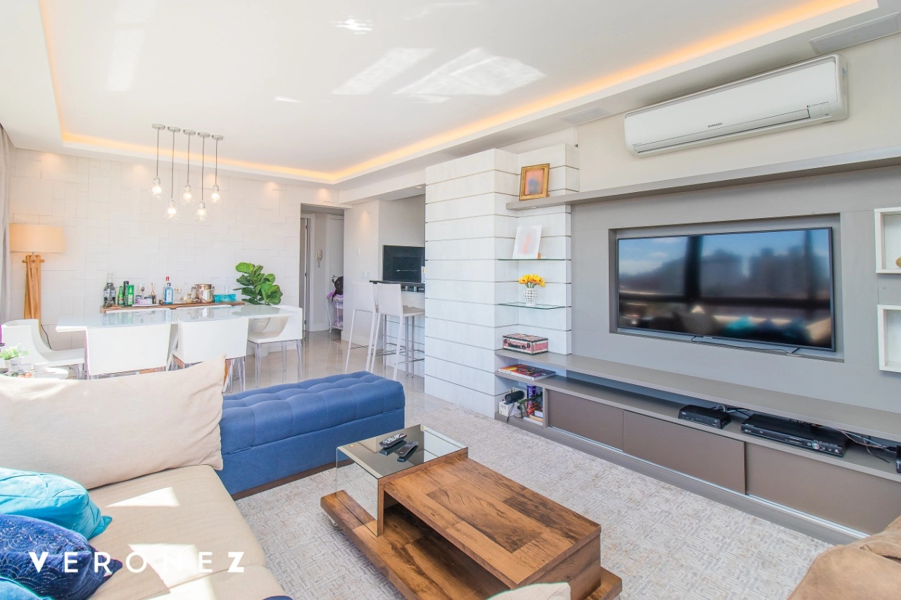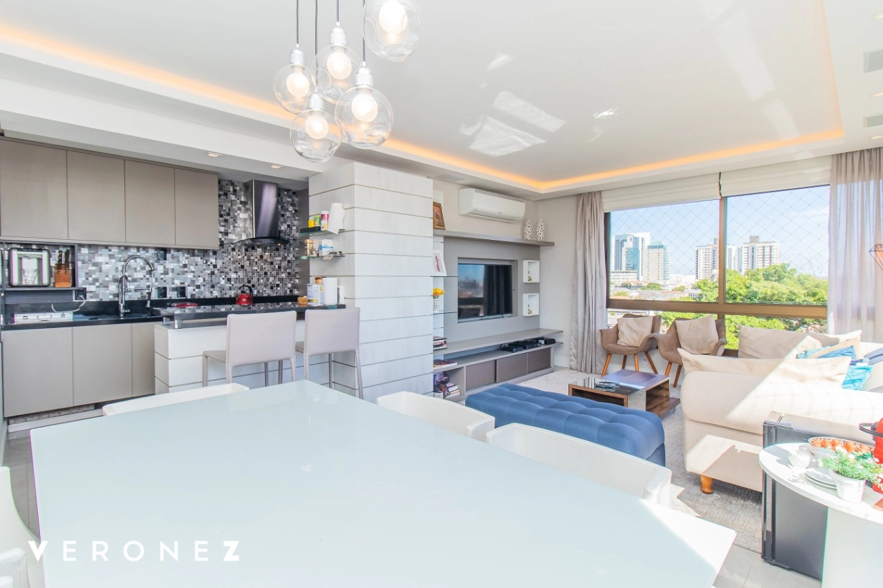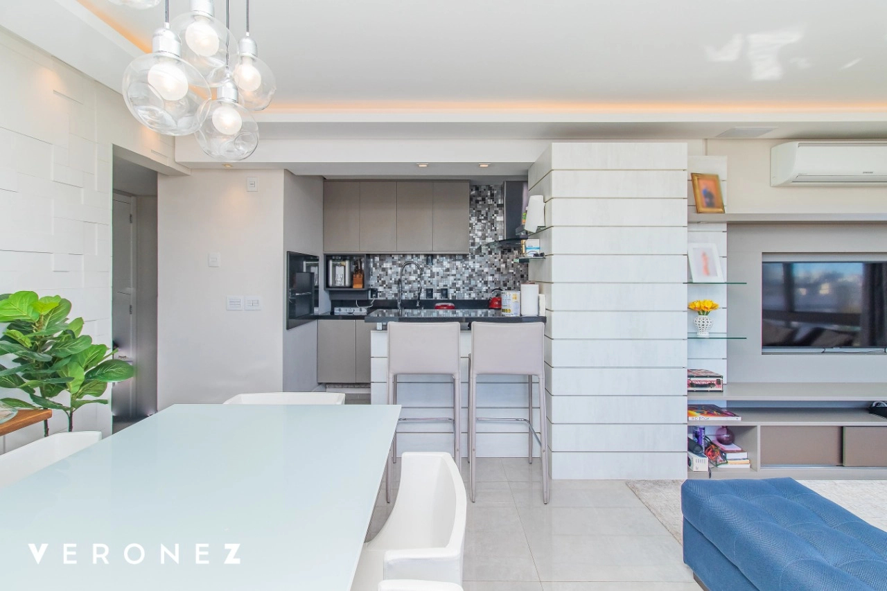 Apartamento decorado e mobiliado com 90m², 3 dormitórios (transformado em 2) , uma suíte, living amplo ensolarado e com esquadrias vidro em toda sala. Cozinha americana com churrasqueira e área de serviço separada. Apartamento com ótima posição solar e linda decoração. Duas vagas de garagem separadas e escrituradas.