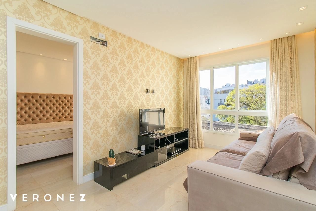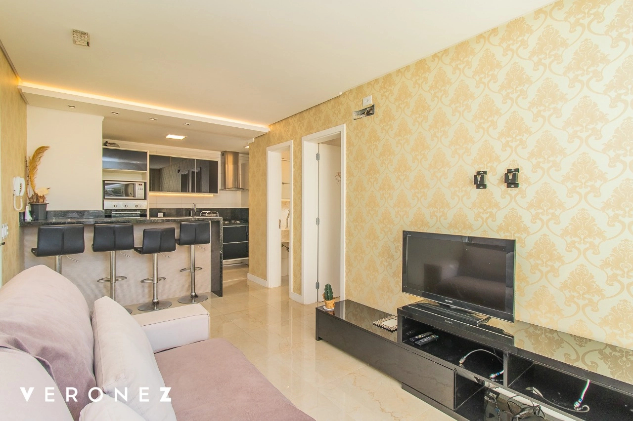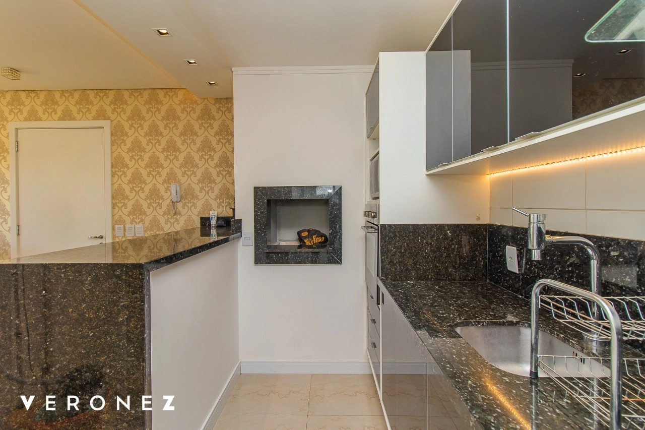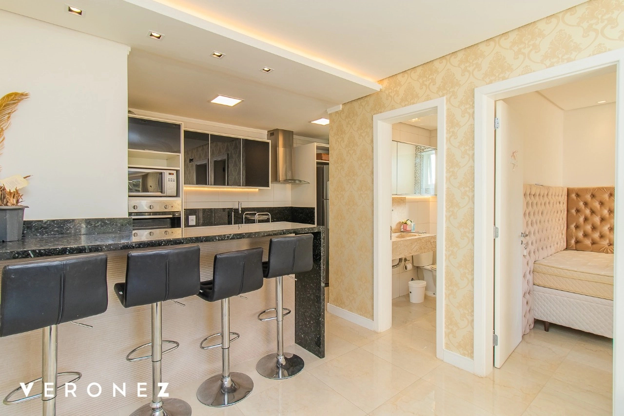 Lindo apartamento mobiliado com 1 dormitório, 44 m², 1 vaga de garagem escriturada e coberta. Ensolarado, Cozinha americana mobiliada com churrasqueira, área de serviço fechada com lava e seca. Banheiro social completo e dormitório com armários.