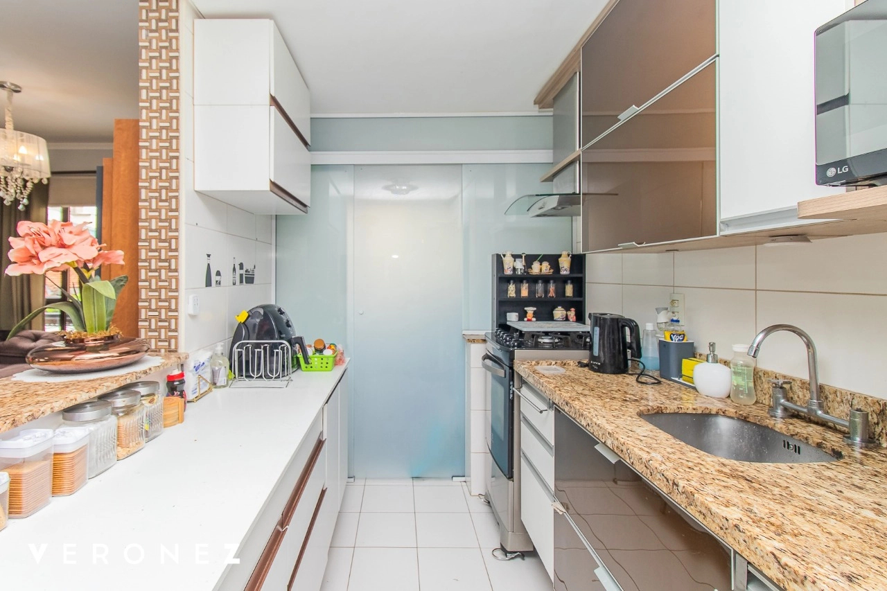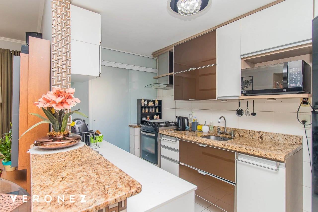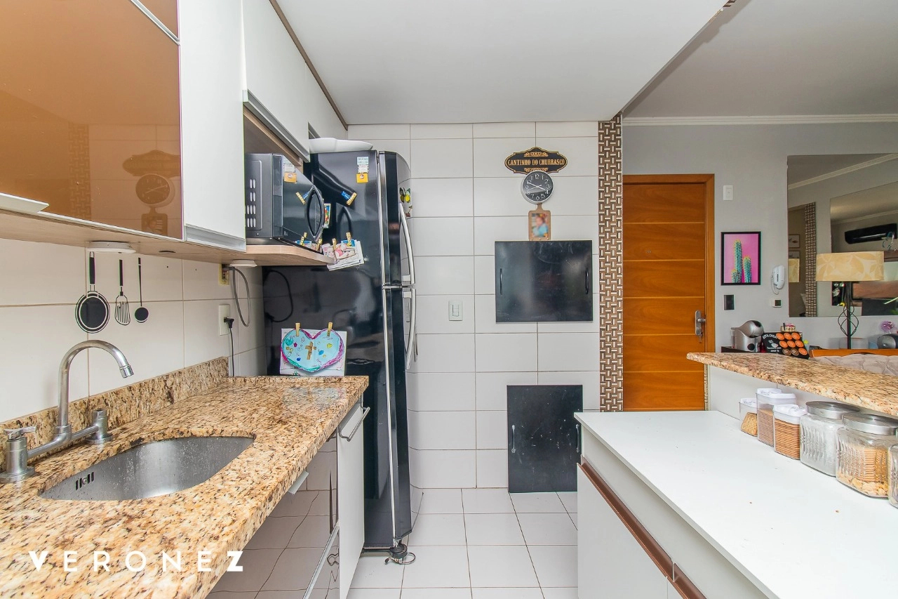 Com 75m² privativos, 2 dormitórios sendo 1 suíte, cozinha integrada com churrasqueira, área de serviço separada e vaga dupla de garagem coberta.