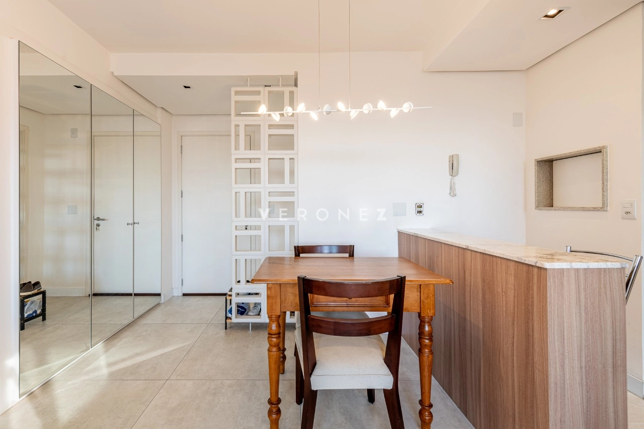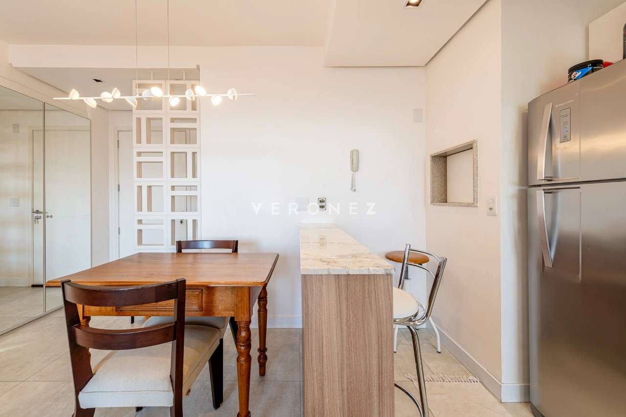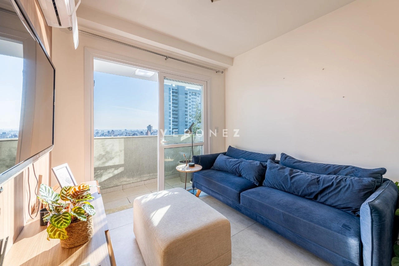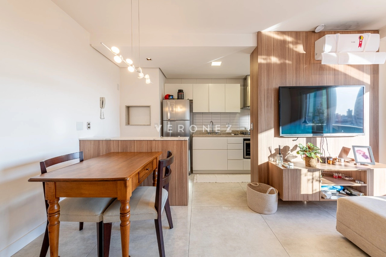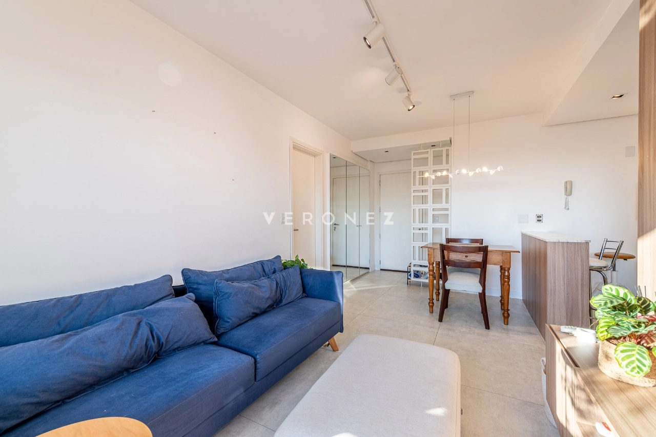 Apartamento de 52m² privativos, 1 dormitório com suíte, living amplo com móveis planejados e lavabo, sacada aberta com vista panorâmica em andar alto, churrasqueira, cozinha planejada e área de serviço individualizada, além de uma vaga de garagem.
