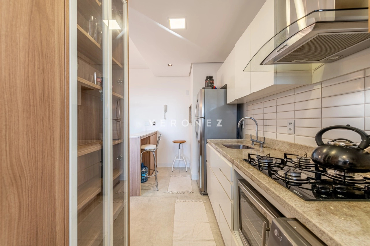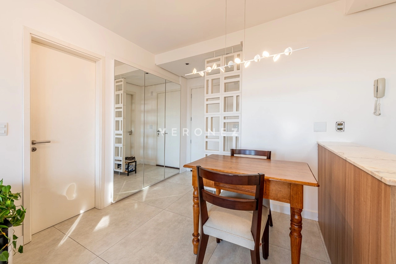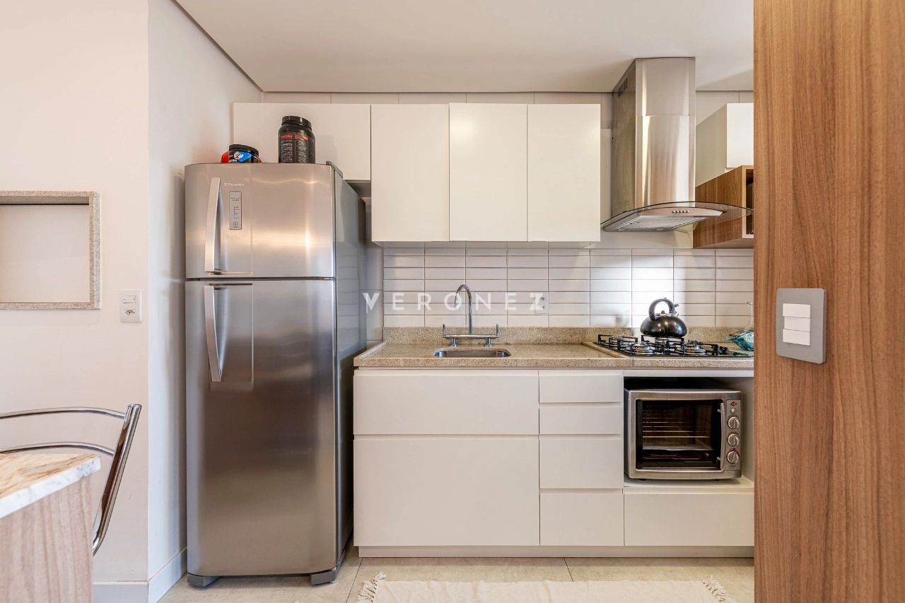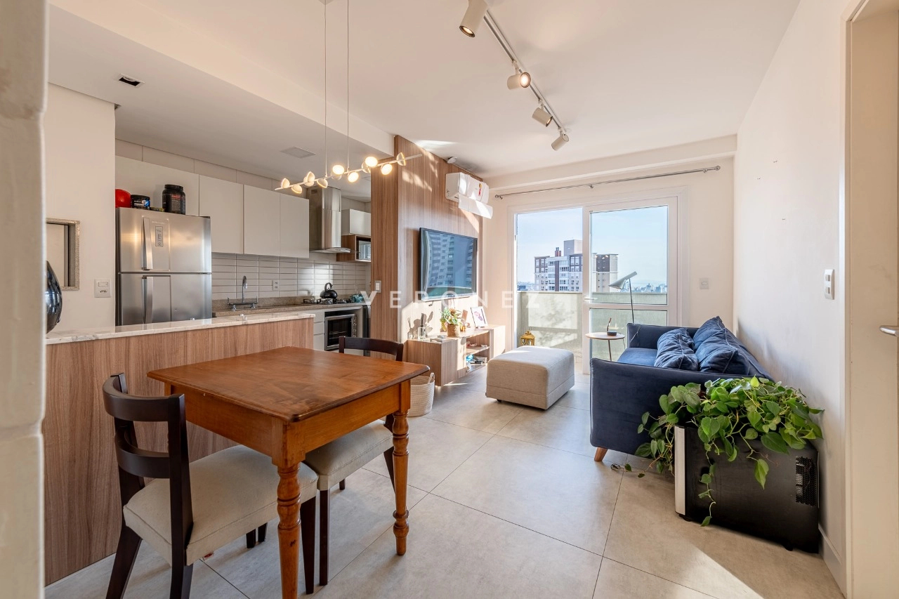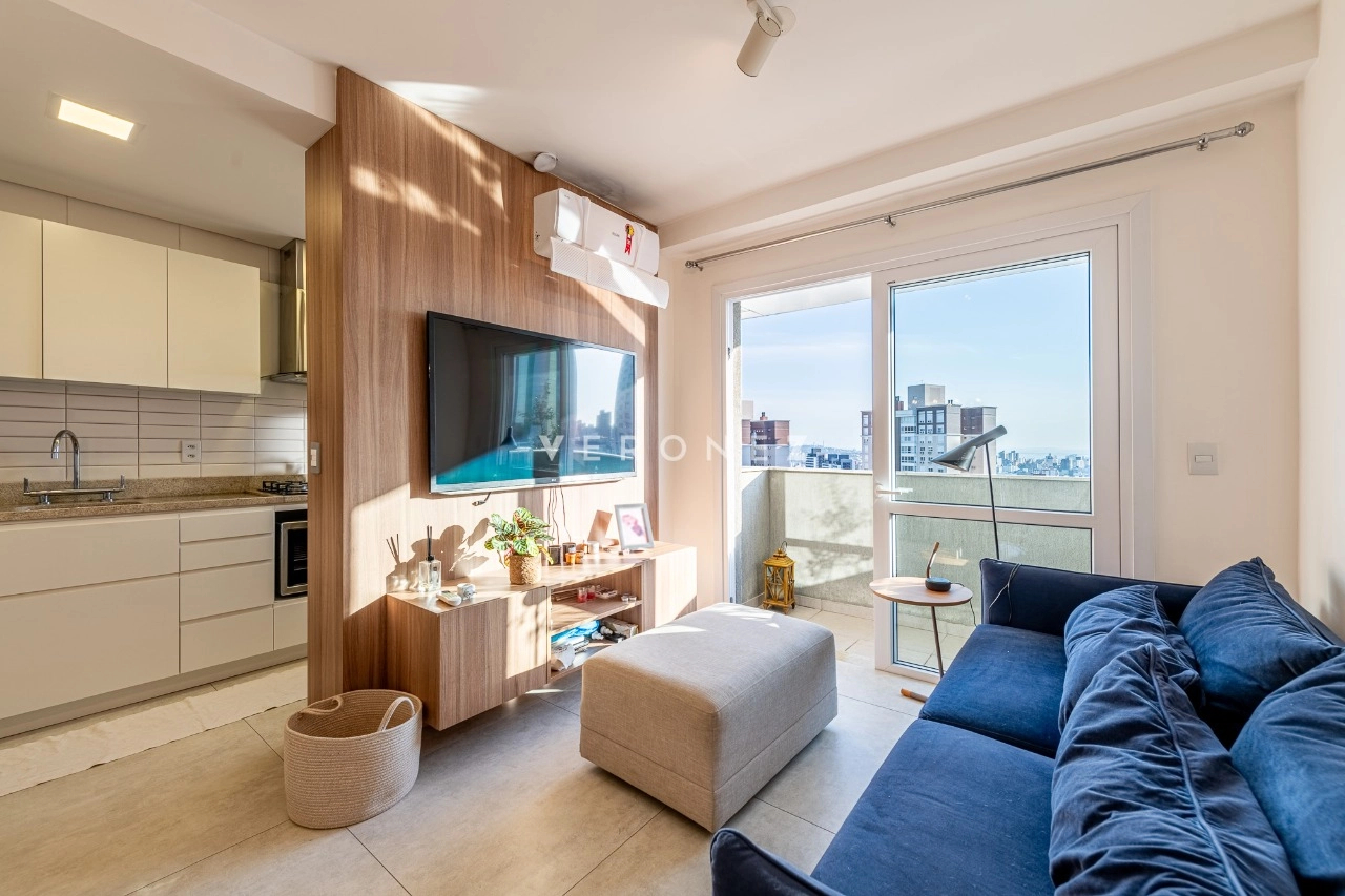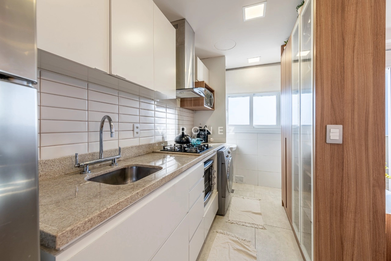 Apartamento de 52m² privativos, 1 dormitório com suíte, living amplo com móveis planejados e lavabo, sacada aberta com vista panorâmica em andar alto, churrasqueira, cozinha planejada e área de serviço individualizada, além de uma vaga de garagem.