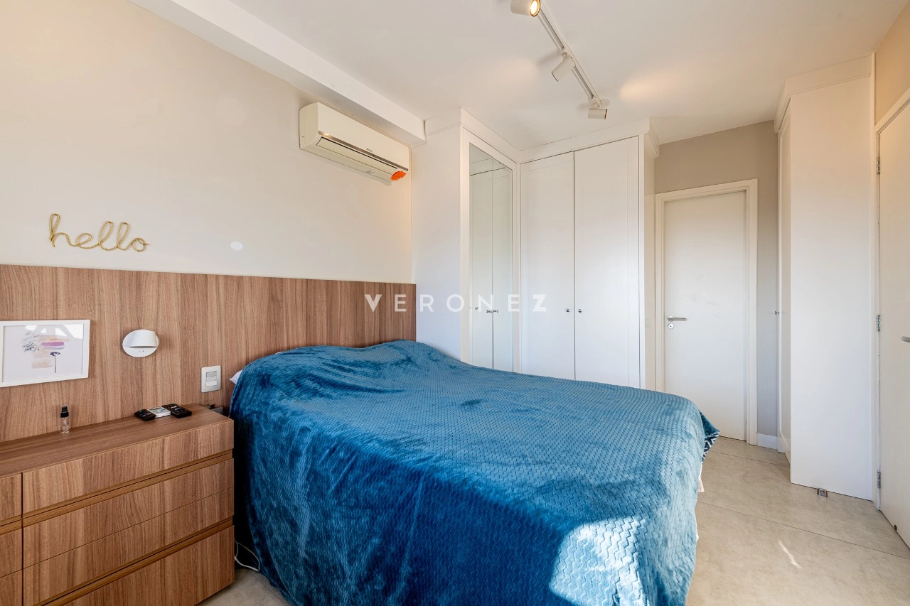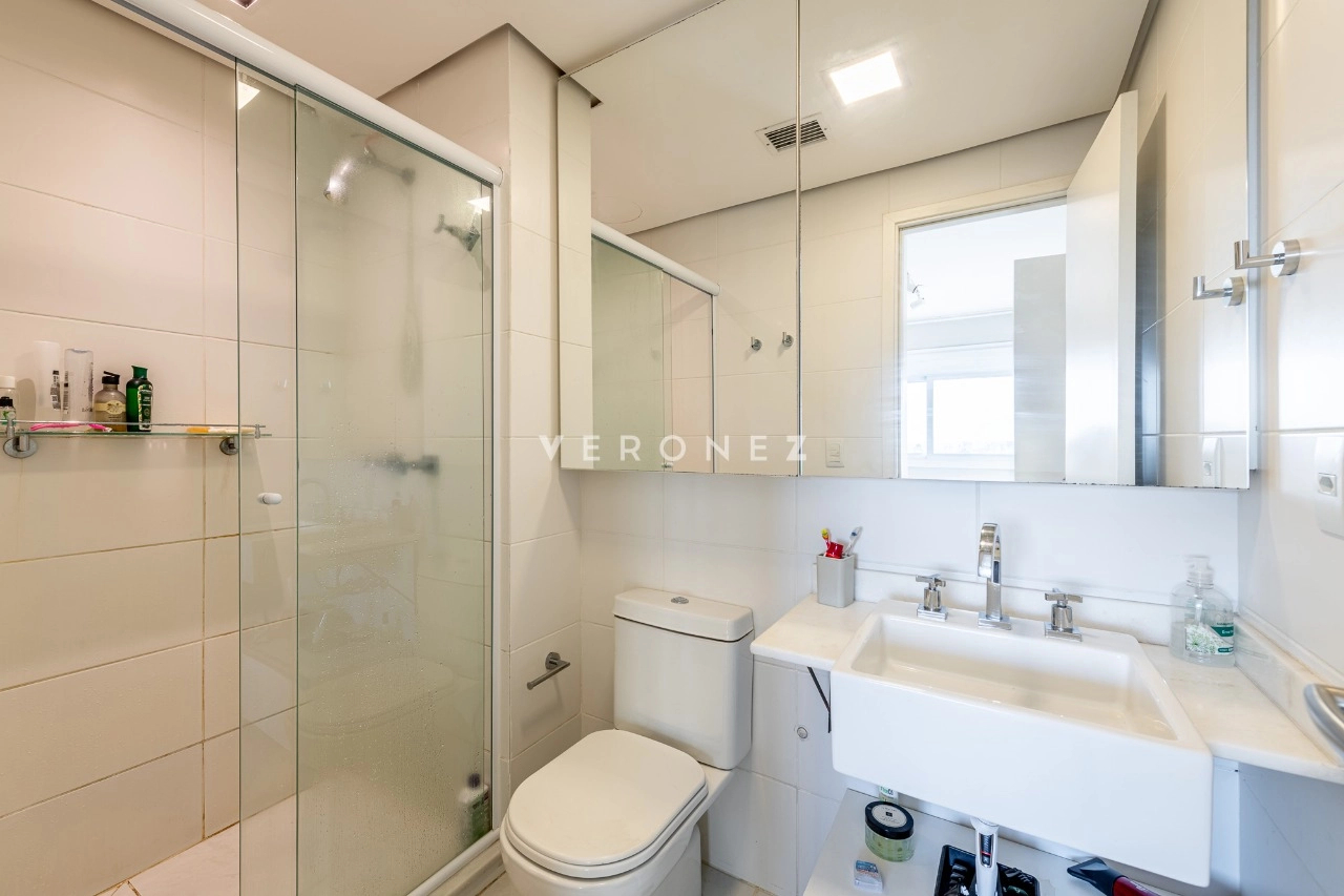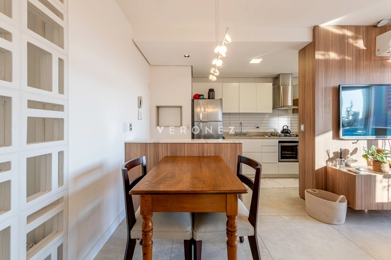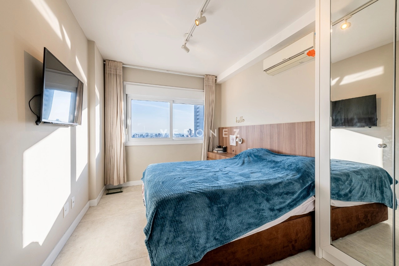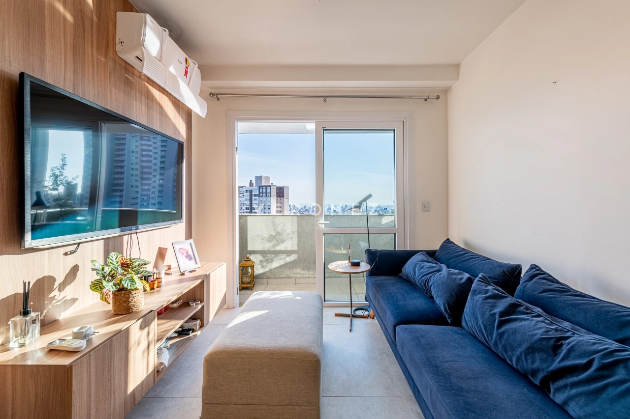 Apartamento de 52m² privativos, 1 dormitório com suíte, living amplo com móveis planejados e lavabo, sacada aberta com vista panorâmica em andar alto, churrasqueira, cozinha planejada e área de serviço individualizada, além de uma vaga de garagem.